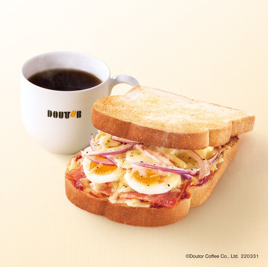 ベーコンとスライスしたゆで卵に、3種のチーズを挟みました。ドトールこだわりの配合でブレンドした、サムソー、エメンタール、熟成チェダーのとろけるチーズは、クリーミーで味わい深い仕上がりに。焼成したベーコンの薫りが引き立つ、ジューシーで食べ応え抜群のホットのモーニングです。