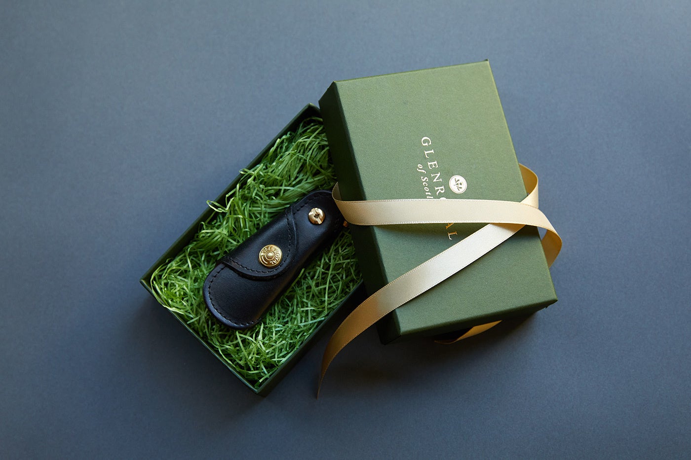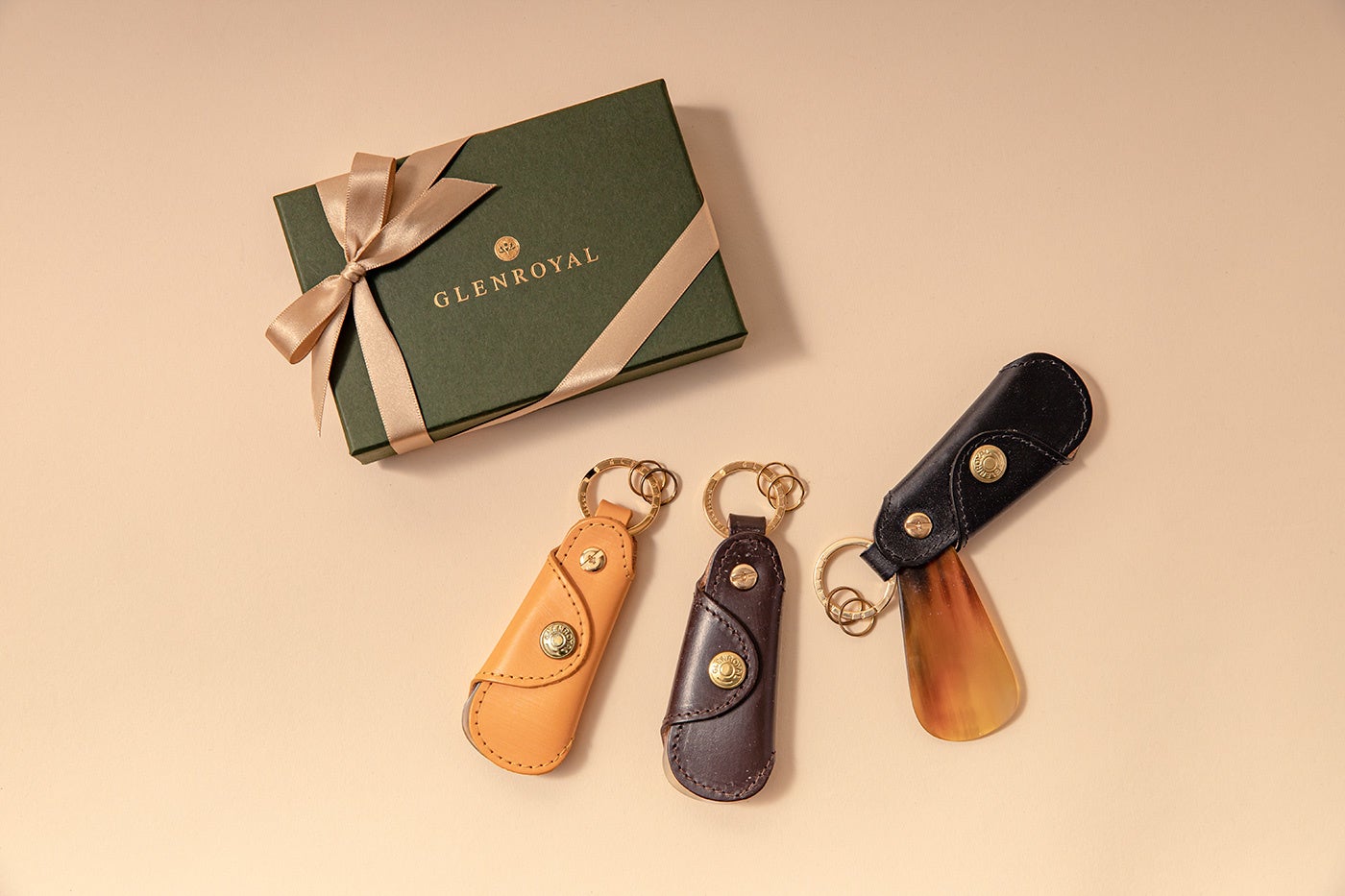 グレンロイヤルのポケットシューホーンは、1本1本異なる表情を持つ水牛の角を使用したホーンを、英国伝統のブライドルレザーで包み込んだ贅沢なアイテムです。スナップボタンやキーリングはゴールドカラーで統一され、高級感漂う仕上がりに。