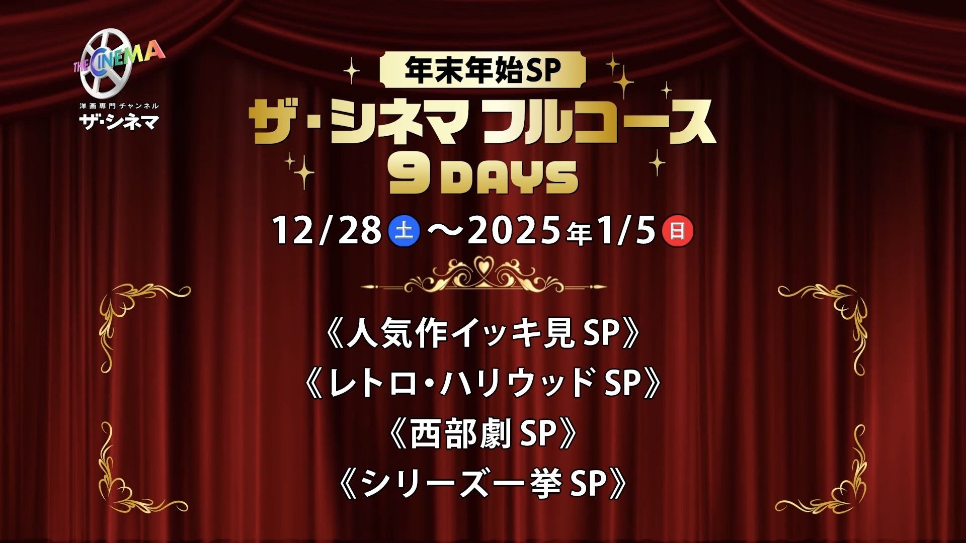 年末年始の9日間はザ・シネマの美味しいところを一気にご提供!ダイヤモンドシネマでお届けしてきたメガヒット作など人気のある作品をお届けする《人気作イッキ見SP》、人気シリーズを一気に見られる好評企画《シリーズ一挙SP》、さらに毎月レギュラーコーナーでお届けしている《レトロ・ハリウッドSP》や《西部劇SP》など特別編成で大特集!ザ・シネマの魅力を余すところなく味わえるフルコースをご堪能あれ!