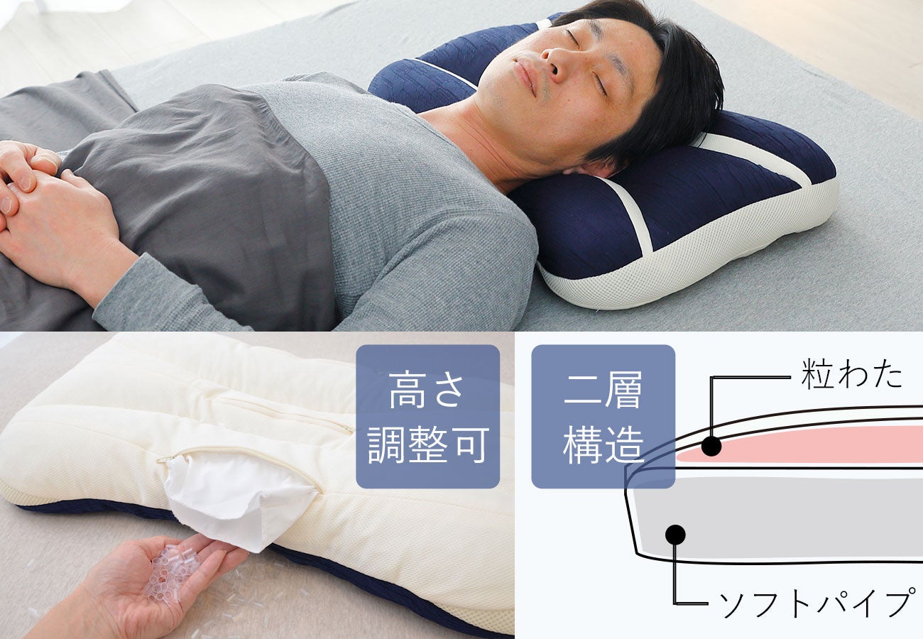 セットになっている枕は、シンプルでスタンダードな寝心地の枕。なめらかな肌触りと通気性に優れた構造が特徴です。底面にあるファスナーから素材を出し入れすることで高さの調節をすることができます。