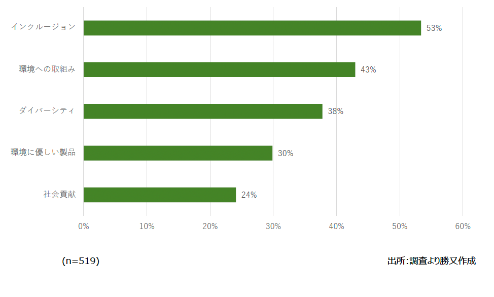 企業を選ぶ際に、どのようなサステナビリティや社会的配慮に重点を置きますか? という設問に対しては「インクルージョン」 (例: 全ての社員が平等に扱われる環境作り)が最も多く、環境への取り組み(例: 環境保護活動、持続可能なビジネスプラクティス)、および「環境に優しい製品やサービスの提供」も上位となりました。3位には「ダイバーシティ」(例: 性別や人種の多様性、障がい者支援)が上がっています。 ※複数回答時、選択した項目を1とカウント