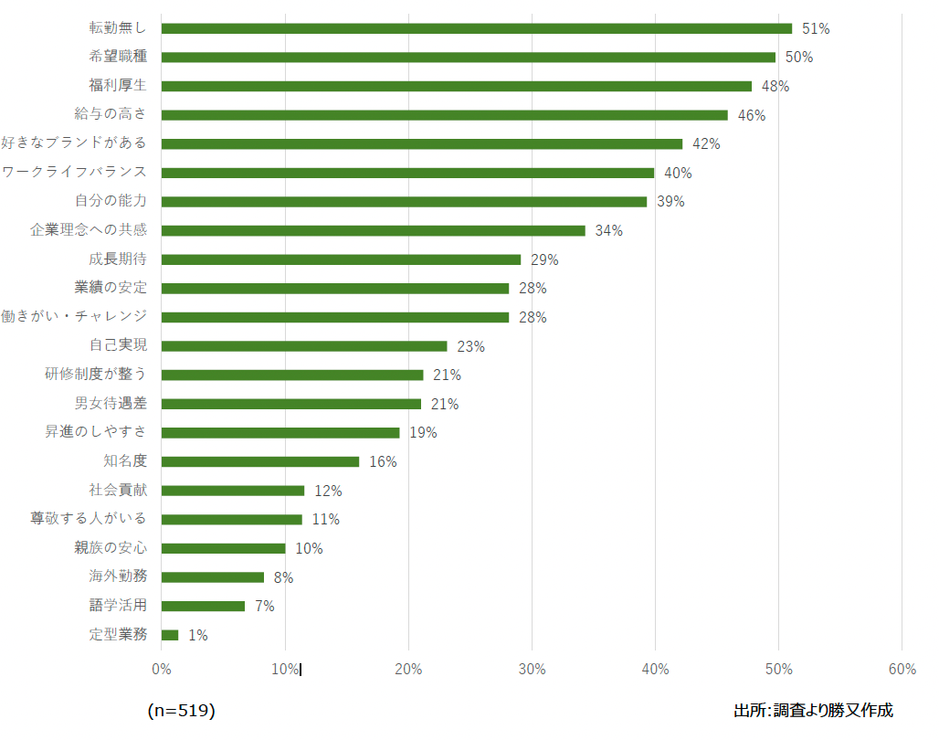 全体の傾向として、学生が就職先を検討するにあたり、企業に求めていることの1位は「転勤なし」、続いて「福利厚生」「給与の高さ」でした。その背景には、経済の先行きが不透明であり、将来的にパートナーと結婚を視野に入れた場合でも共働きを検討するため、転勤を希望しないケースが有意となっています。ファッション業界を志す学生においても「生活の安定」が第一になっていると考えられます。 ※複数回答時、選択した項目を1とカウント