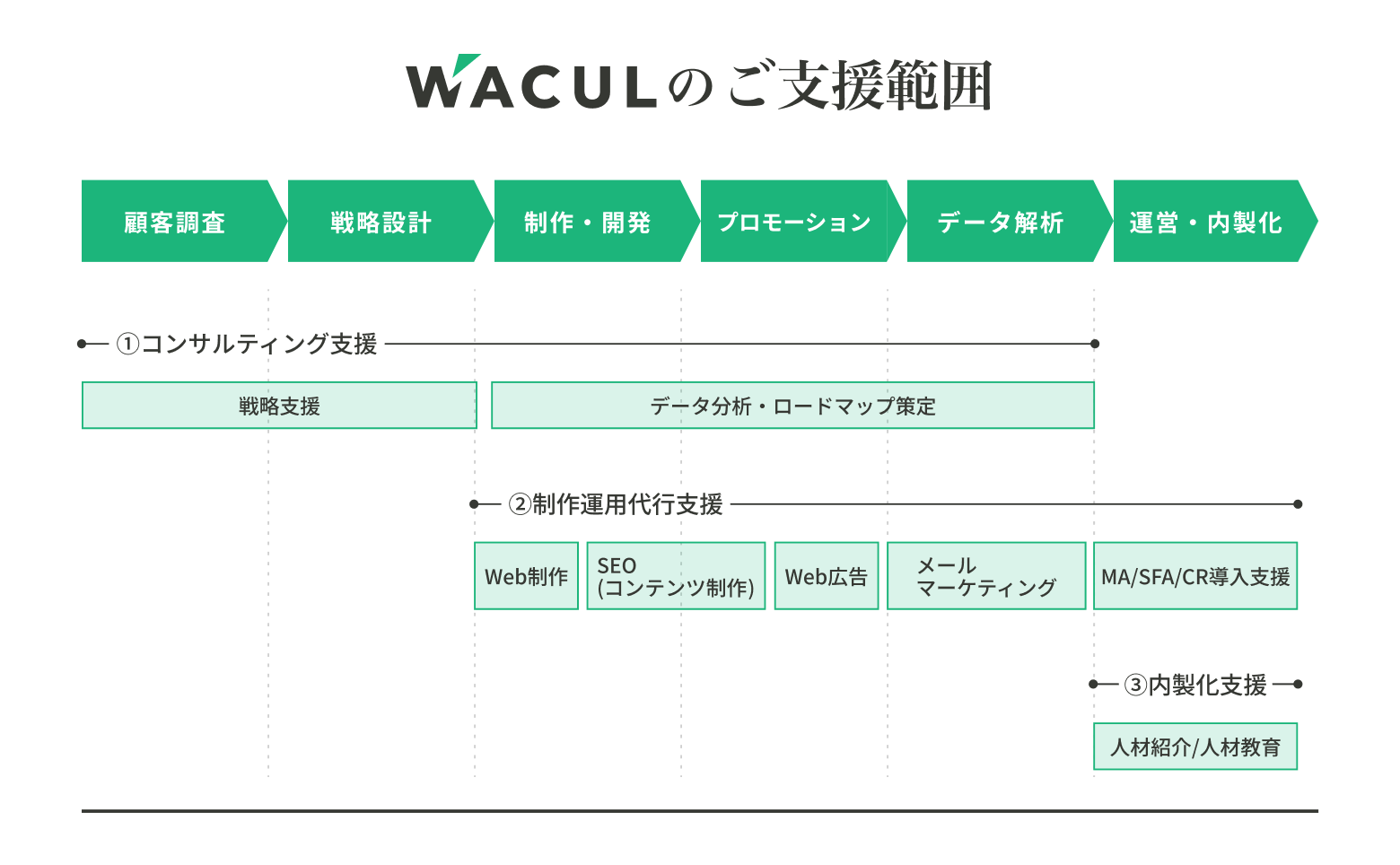 2010年にデジタルマーケティングのコンサルティング事業を開始し、人工知能等を活用したデータアナリティクスの先進テクノロジーとコンサルティングを通じて蓄えた知見とを融合し、2015年から「AIアナリスト・シリーズ」を提供。さらに組織設計から戦略立案を行うWACUL DXコンサルティング、フリーランスのデジタル人材のマッチングなどを加え、マーケティング&セールスのDXを通じて、クライアントの売上最大化を効率的に実現します。