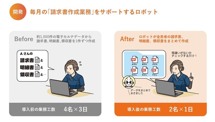 毎月1,000名にものぼる在宅患者の診療を行ういしが在宅ケアクリニックでは、バックオフィス業務のサポートにRPAが活用されています。そのうちのひとつが「請求書作成ロボット」です。診療する患者数と同等の請求書を毎月発行していますが、特に施設宛の請求書は非常にタイトな期日で発行が求められ、短期間でミスなく発行する必要があることから、事務スタッフの残業と精神的な負担が増加していました。しかしロボット導入後は、作業時間が1/6程度にまで減少し、時間に追われるストレスと残業がなくなりました。
