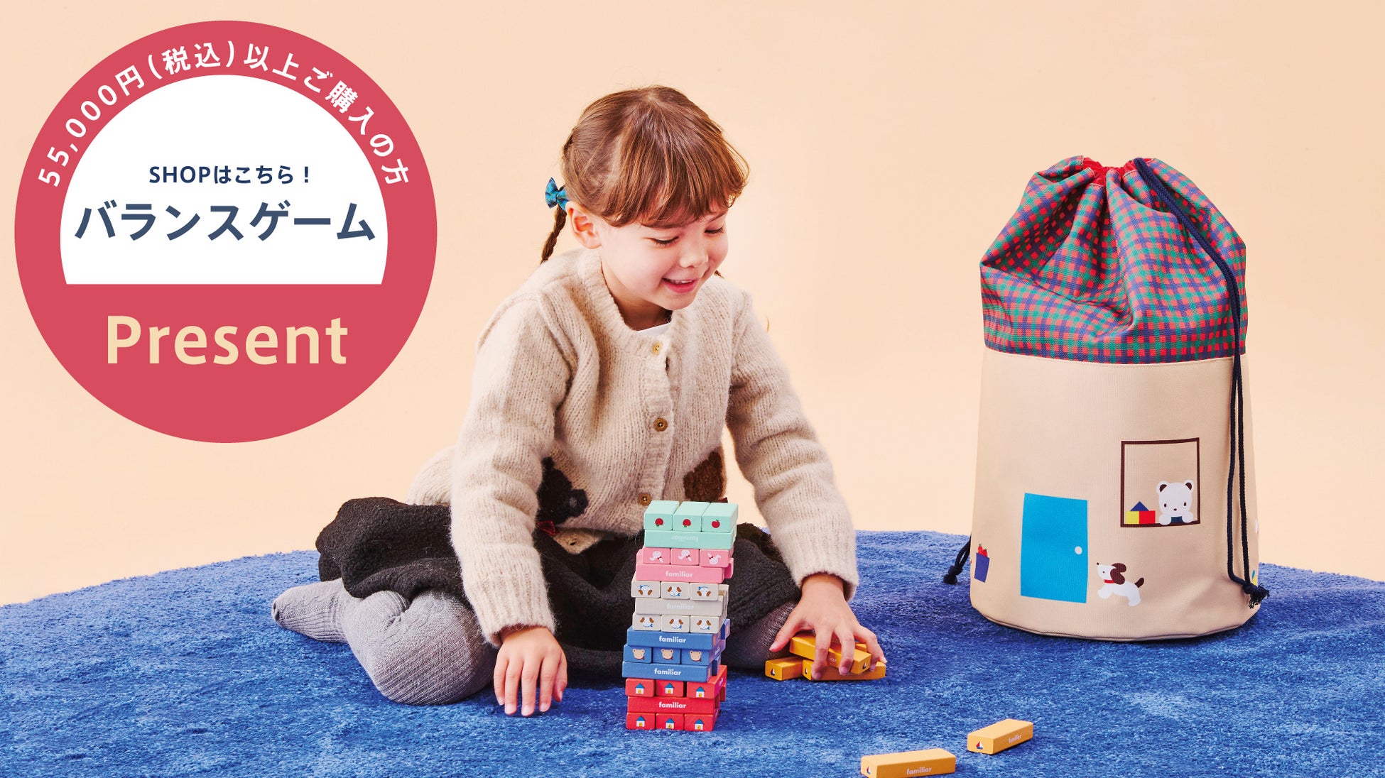 新作のテーマにあわせおもちゃの収納に便利なファミリアチェックのおうち型収納袋と木製バランスゲームを購入特典でプレゼント
