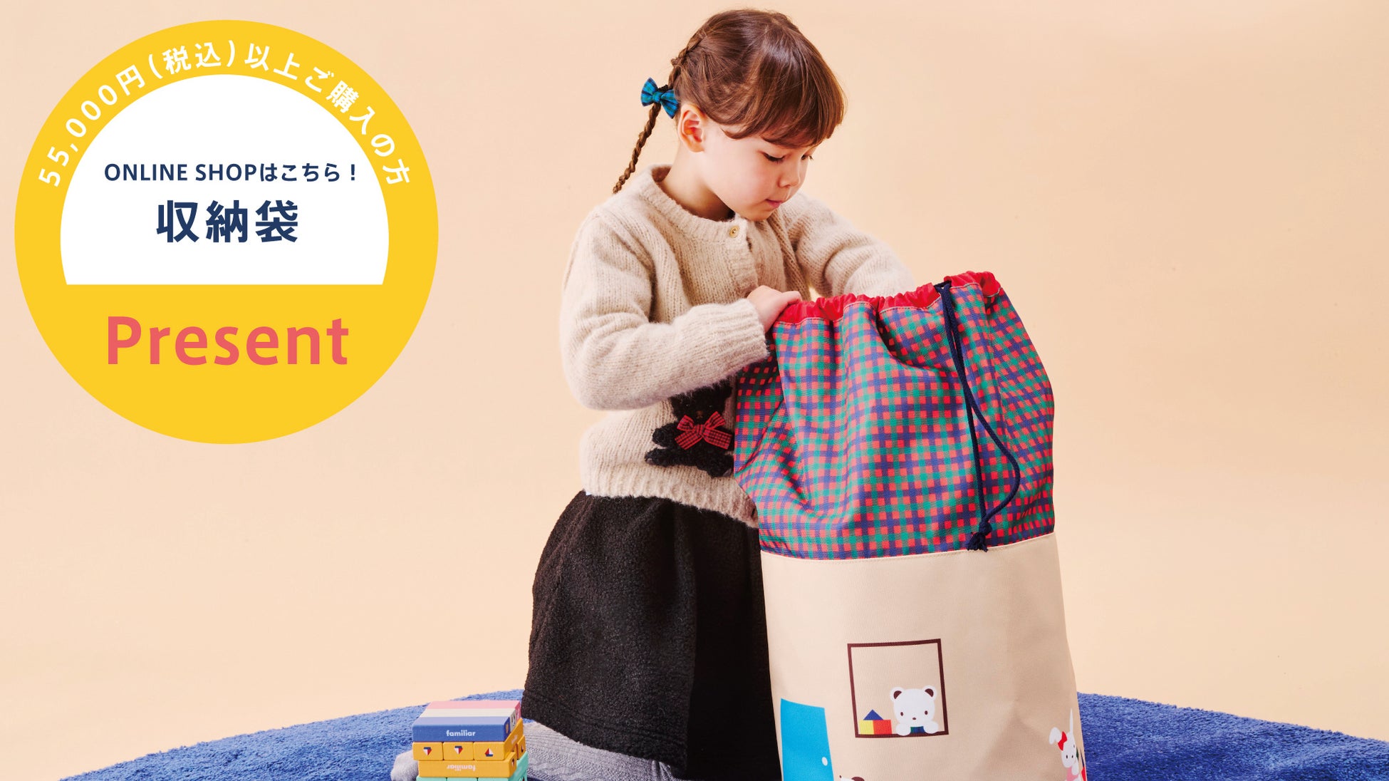 さらに、冬のおうち時間にぴったりな豪華ノベルティ2種類が登場。ファミリアオンラインショップでは、おもちゃや衣類の収納に便利な大容量「収納袋」をプレゼントいたします。巾着部分には赤系ファミリアチェックをあしらい、紐を結ぶとおうちの形になるかわいらしいデザインです。全国のファミリアショップではクマちゃんやりんごなどファミリアらしいアートが描かれた家族で遊べる「バランスゲーム」をプレゼントいたします。この機会にぜひ、ファミリアの新作ニットをお楽しみください。