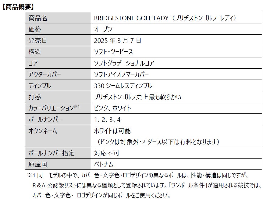 ブリヂストンスポーツ株式会社は、「BRIDGESTONE GOLF」史上最も軟らかい女性ゴルファー専用ゴルフボール『BRIDGESTONE GOLF LADY』を3月7日に発売します。価格はオープンです。