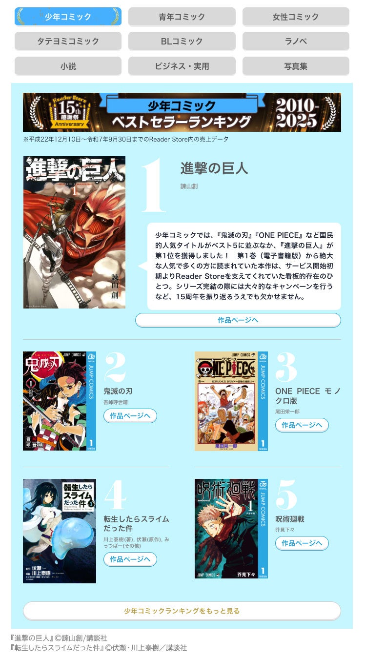 【少年コミック】は、『進撃の巨人』が第1位となりました! 本作はReader Storeサービス開始当初からの大人気作品で、最新刊が出るたびユーザーの注目を集め、数多くの関連キャンペーンも実施したりと、Reader Storeの15年間において欠かせない名作です。コミックスの完結から約5年が経とうとしていますが、いまだにベストセラーコミックとして君臨し続けています。