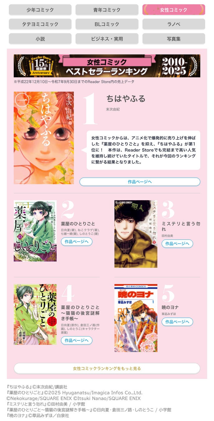 いっぽう第2位『薬屋のひとりごと』は、2023年のアニメ化からReader Storeでの購入者が急増し、現在最も勢いのあるタイトルのひとつ。2024年度のベストセラーランキングでは【女性コミック】の第1位に輝いています。