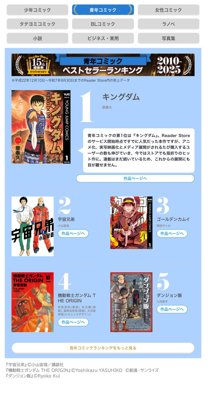【青年コミック】は、『キングダム』が第1位に! 『進撃の巨人』と同じくReader Store最初期から多くの読者を獲得し、アニメ化・映画化を経て今では国民的なタイトルとなっています。現在も連載中の本作は、屈指の人気コミックとしてReader Storeユーザーに愛され続けています。