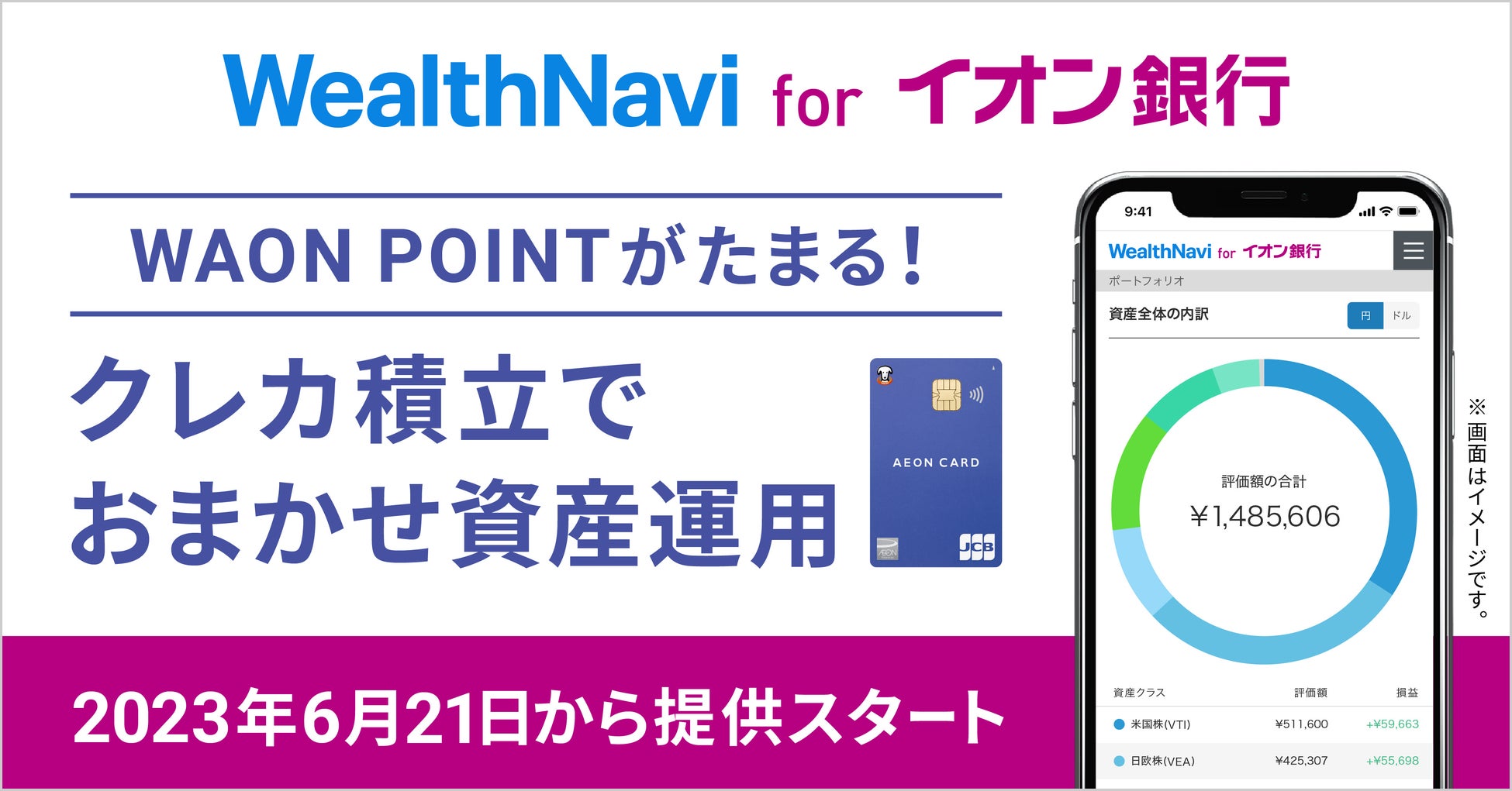 「WealthNavi for イオン銀行」に関するサービス案内、注意事項、お申込み、利用条件についてはご利用URL(https://www.aeonbank.co.jp/wealthnavi/)をご覧ください。