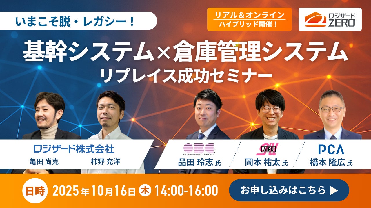 クラウド型在庫管理システムのリーディングカンパニーであるロジザード株式会社(東京都中央区、代表取締役社長:金澤 茂則、以下:ロジザード)は、2025年10月16日(木)14時より開催する『いまこそ脱・レガシー!基幹システム×倉庫管理システム リプレイス成功セミナー ~システムリプレイスのトレンド、事例を徹底解説!~』に、勘定奉行・奉行クラウドをはじめとする基幹業務システムを開発・販売する株式会社オービックビジネスコンサルタント(東京都新宿区、代表取締役社長:和田 成史、以下:OBC)の登壇が決定しましたのでお知らせいたします。