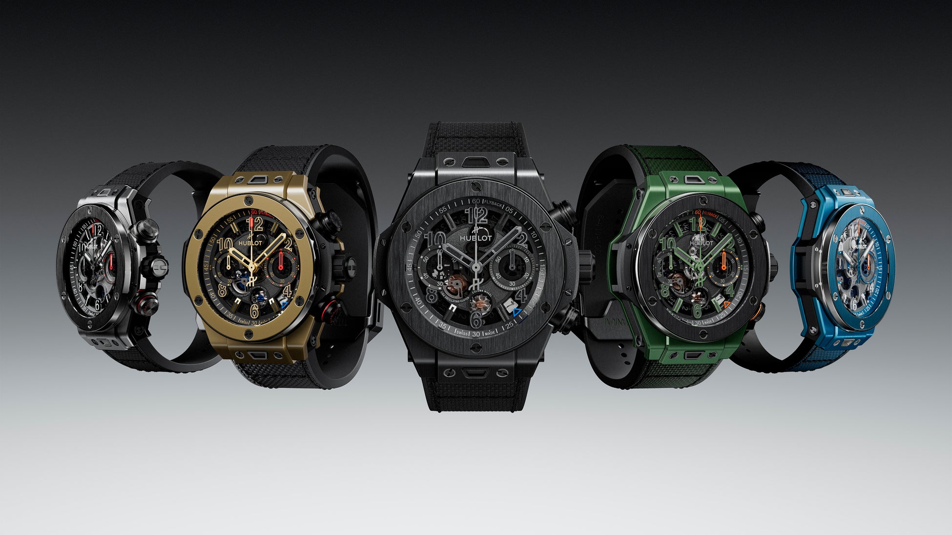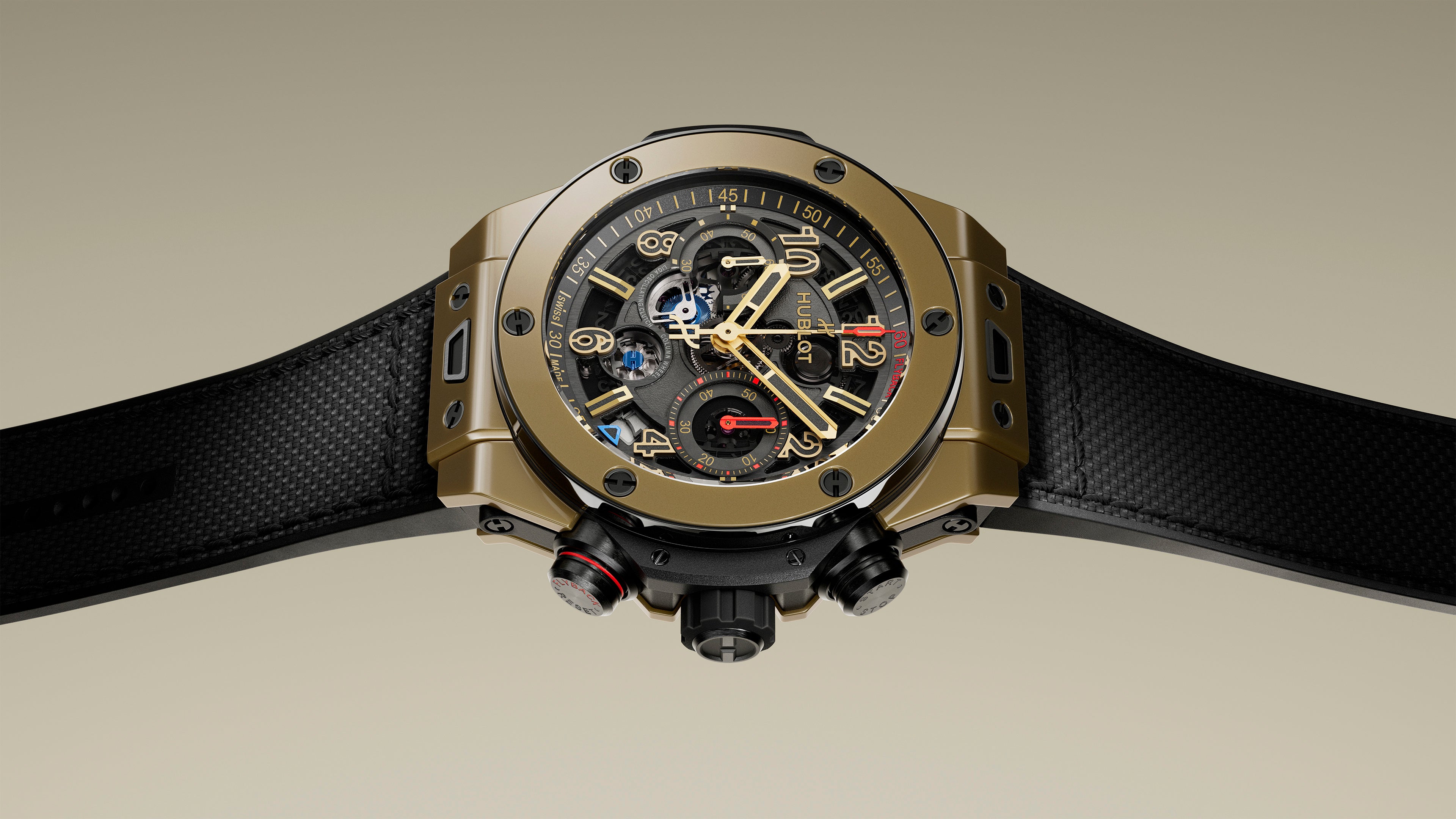 「ビッグ・バン リローデッド」は、ウブロの素材に対する卓越した技術と、重要なアニバーサリーを祝います。それは、「オールブラック」コンセプト(2006年)の20周年と、「マジックゴールド」(2011年)の15周年です。これらの定番コレクションは、数十年にわたる研究、革新、クラフツマンシップをひとつのアイコンへと融合させています。マジックゴールドのモデルは、スイス連邦工科大学ローザンヌ校の冶金研究所との4年にわたる共同研究を経て誕生し、ニヨンのウブロマニュファクチュールで完全に自社製造された独特のブロンズのような輝きをもつ、ダイヤモンドに次ぐ硬度を誇る世界初の「傷の付きにくい18Kゴールド」を採用しています。セラミックは3つのモデルで展開されます。ひとつは、「インビジブル・ビジビリティ(見えない可視性)」という革新的なコンセプトの20周年を記念する「オールブラック」エディションです。加えて、ブルーとダークグリーンのモデルには、従来のセラミックよりも300ビッカース高い硬度を誇る、ウブロのフルカラーハイテクセラミックが採用され、その高い技術力を体現しています。5つ目のモデルは、チタニウムとブラックセラミックを融合させたモデルです。軽量な航空宇宙グレードのチタニウムとテクニカルセラミックを組み合わせることで、高い耐久性を確保しています。また、2013年に発売された初代「ビッグ・バン ウニコ」と同様に、チタニウム製のベゼルとケースにブラックセラミックのケースバックを組み合わせ、卓越した堅牢性を実現しています。