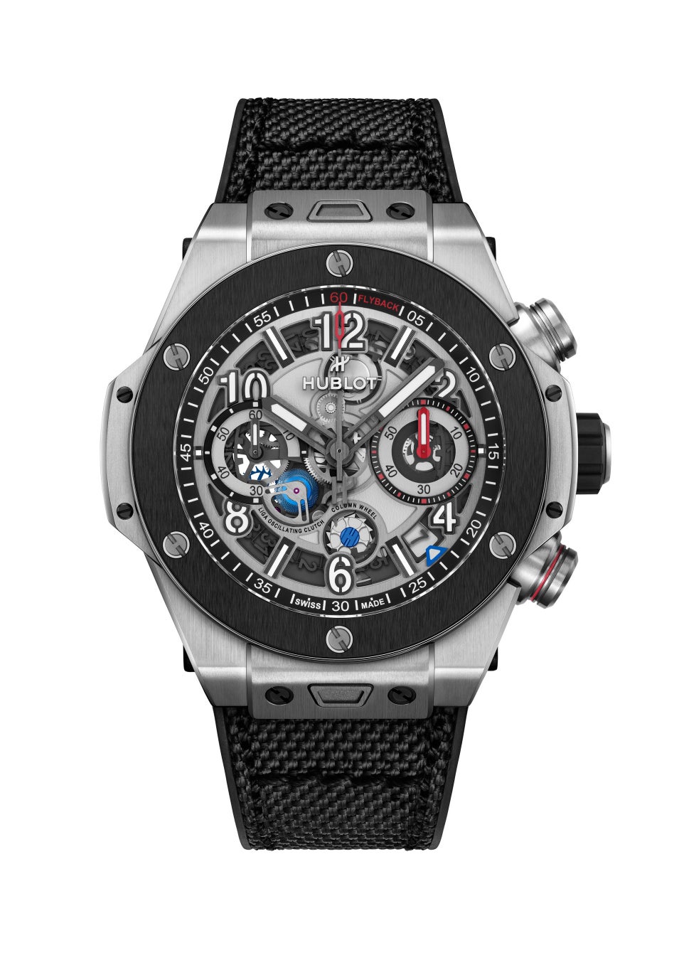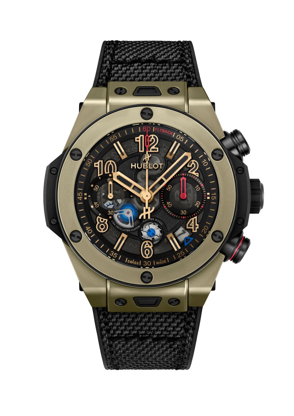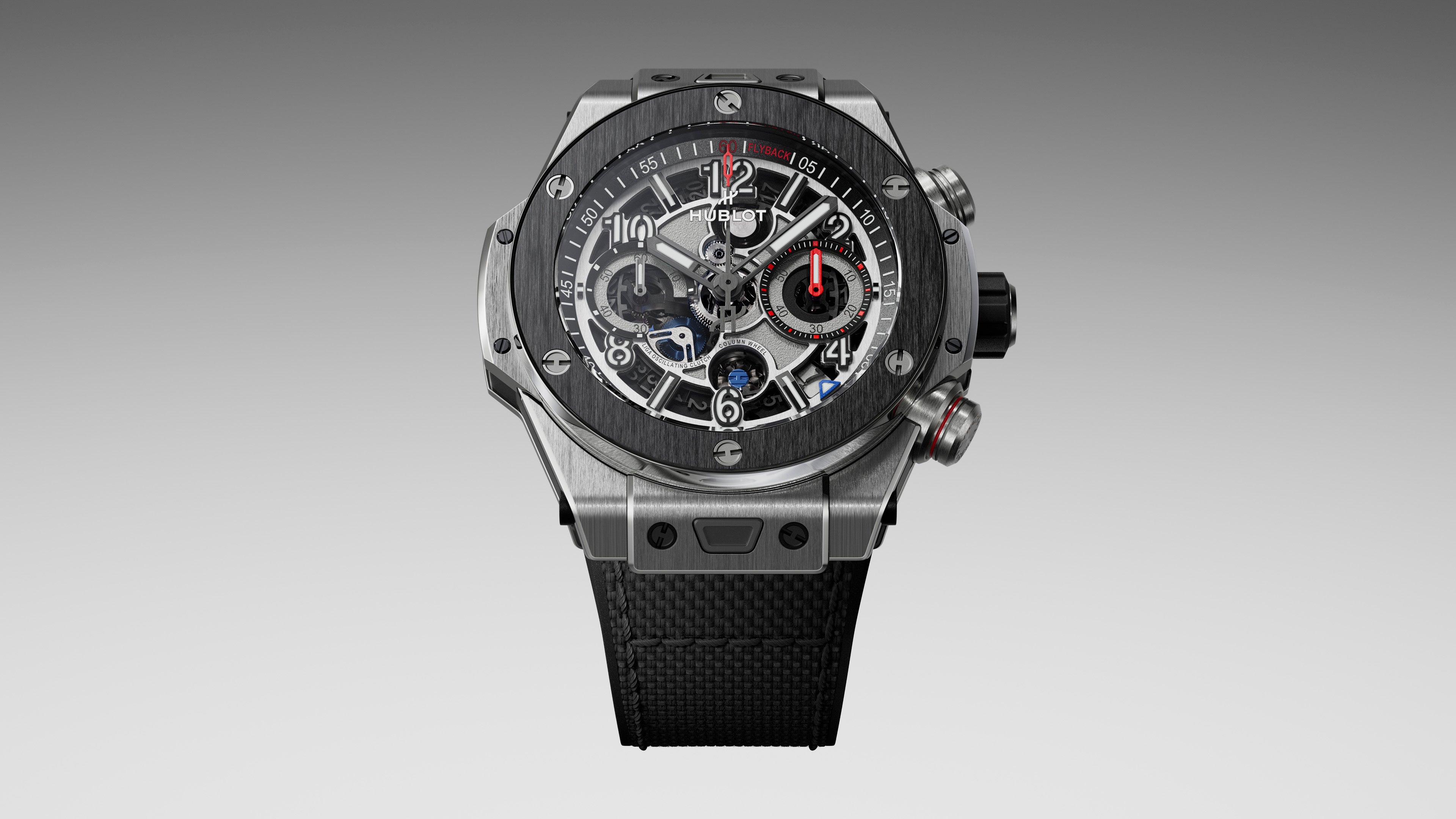 「ビッグ・バン リローデッド」は、そのアイコニックなデザインを忠実に継承しながら、より大胆でスポーティな個性を主張しています。44mmケースは2パーツ構造のベゼルを採用し、素材と仕上げの間により鮮明なコントラストを生み出しています。多層構造のダイアルは、質感と表面のコントラストを巧みに操り、奥行きとテクニカルなエッジを演出しています。クロノグラフ機能も際立っており、4時位置のプッシュピースに施されたカラーリング、刷新された3時位置の分針、フライバックの刻印、そして4時と5時の間に再配置された日付表示が採用されています。ケースバックには、新しいオープンワークのローターに、切り抜かれたHの文字と「Hublot. Design. Manufacture. Nyon」の刻印が施されており、テンプ、香箱、輪列とともにコントラストを生み出しています。各モデルには2種類のストラップが付属します。ひとつはHパターンのステッチが施されたファブリック×ラバーストラップ、もうひとつはクラシックなブラックラバーストラップで、いずれもフォールディングバックルとウブロが特許を持つ「ワンクリック」システムを備え、スポーティなスタイルからエレガントなスタイルまで、瞬時に切り替えることができます。