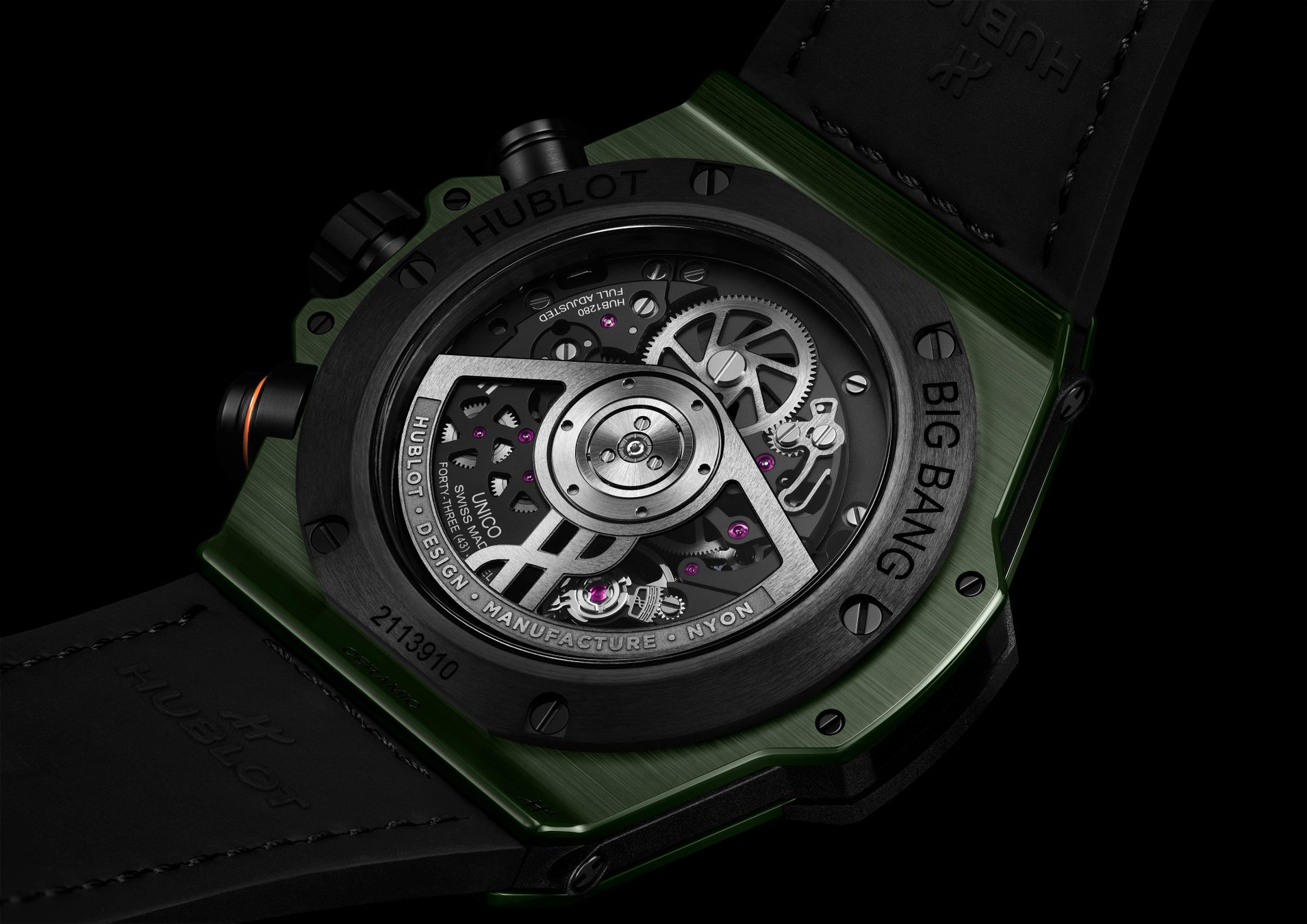 秒針は、その精緻な動きを印象づけます。ケースバックには、新しいオープンワークのローターに、カットアウトされたHの文字と「Hublot. Design. Manufacture. Nyon」の刻印が施されており、テンプ、香箱、輪列とともにコントラストをなしています。