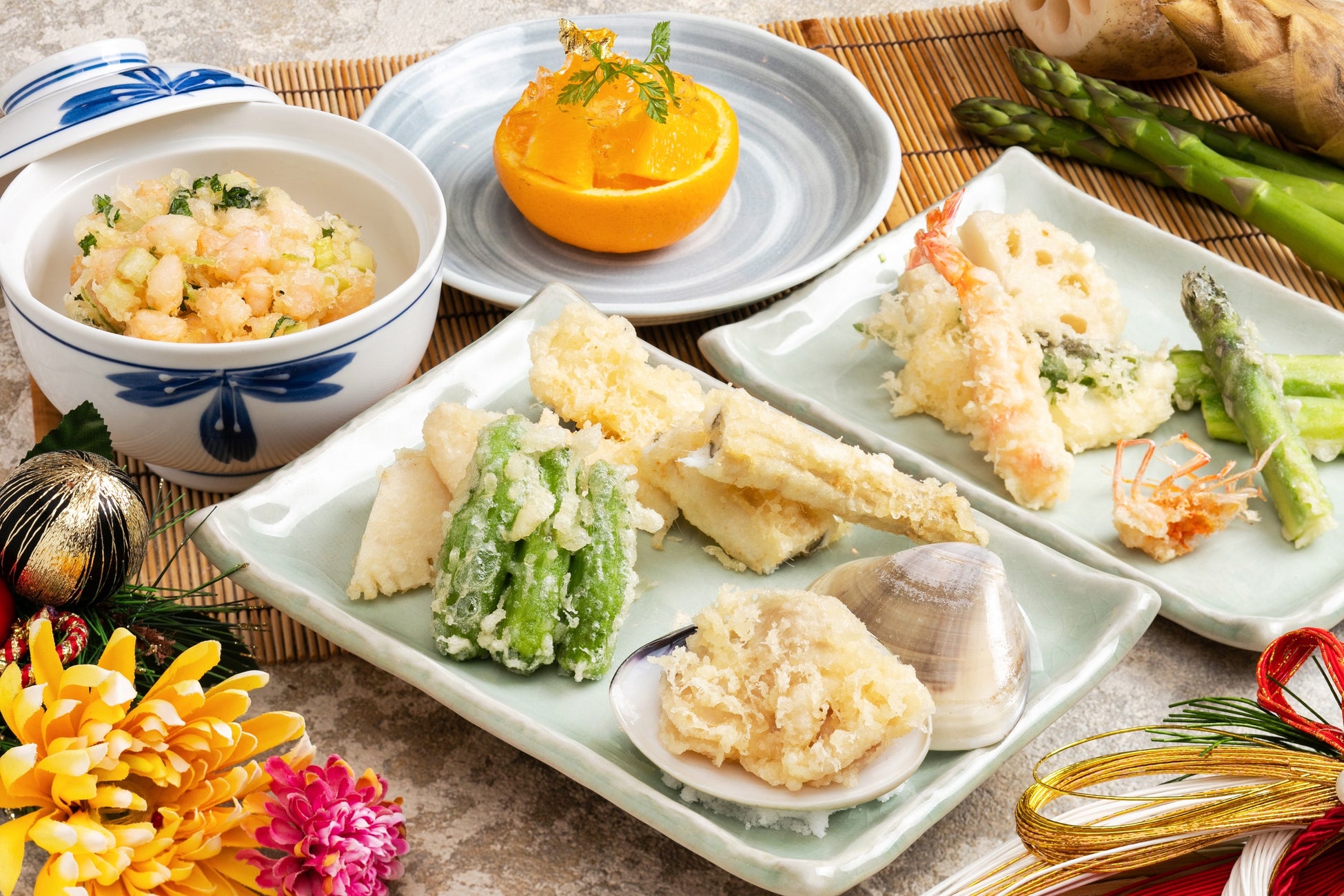 長寿の象徴の海老、将来有望の蓮根をはじめ、鯛、筍などの食材をごま油と綿実油を調合した油で仕上げる職人の熟練の技の天ぷらコースをご堪能ください。