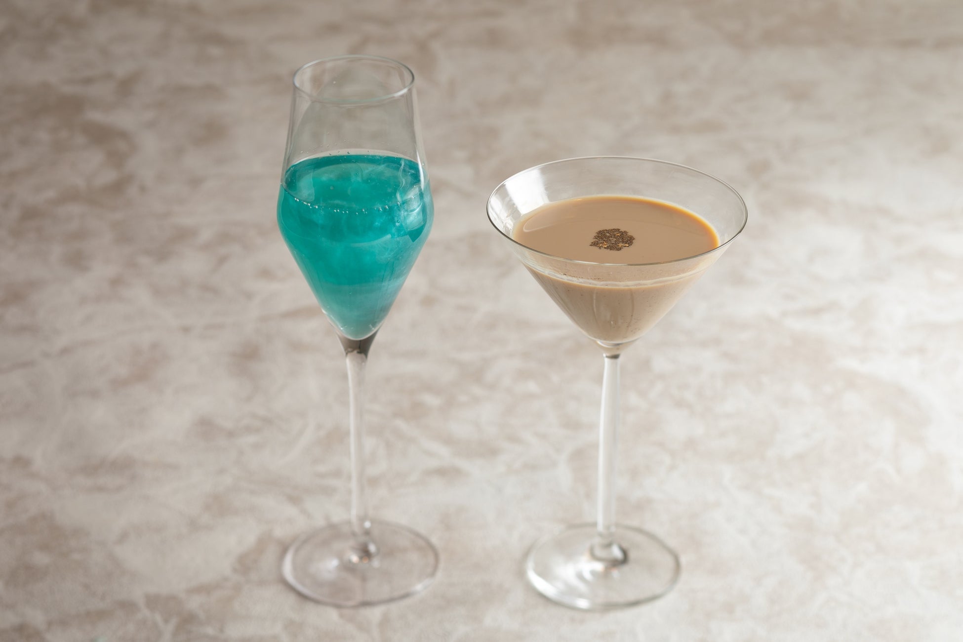 強運カラーの天色とパールホワイトをイメージした「フォーチュンカラー」は、シャンパンにブルーリキュールの甘みを加えた飲みやすいカクテル。シャンパンゴールドとパールホワイトをミックスした「ラッキーゴールド」は、栗のリキュールと生クリームを合わせ、金粉を飾り華やかに仕上げました。