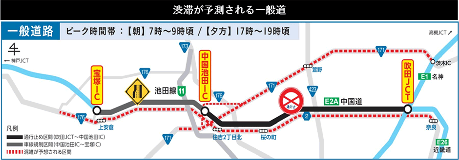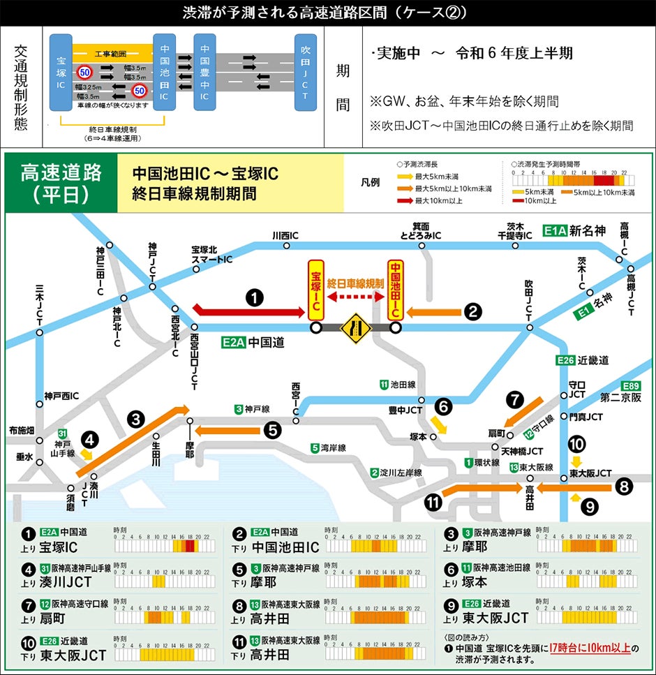 交通規制区間周辺の高速道路および一般道では、時間帯により通常よりも大きな渋滞の発生が予測され、所要時間が多くかかることが見込まれます。事前に最新の交通情報をご確認のうえ、時間に余裕をもってお出かけください。またE1A 新名神などへのう回やご利用時間の変更などにご協力ください。