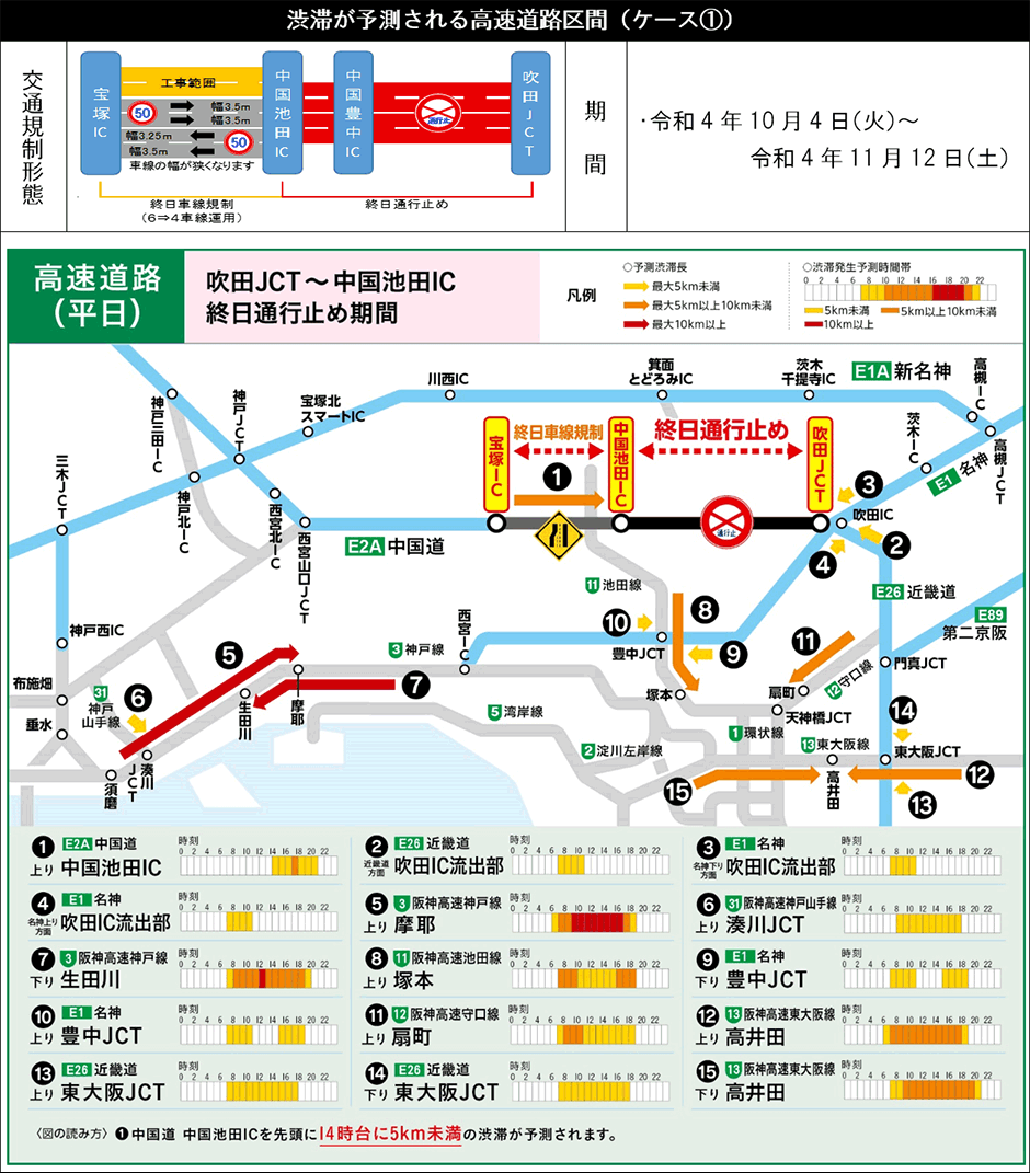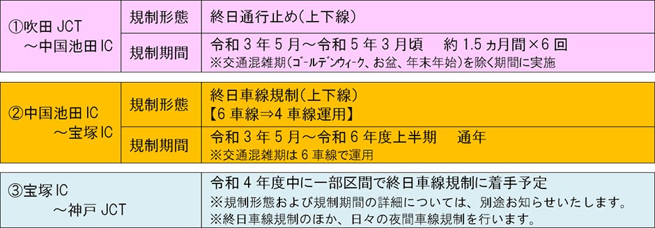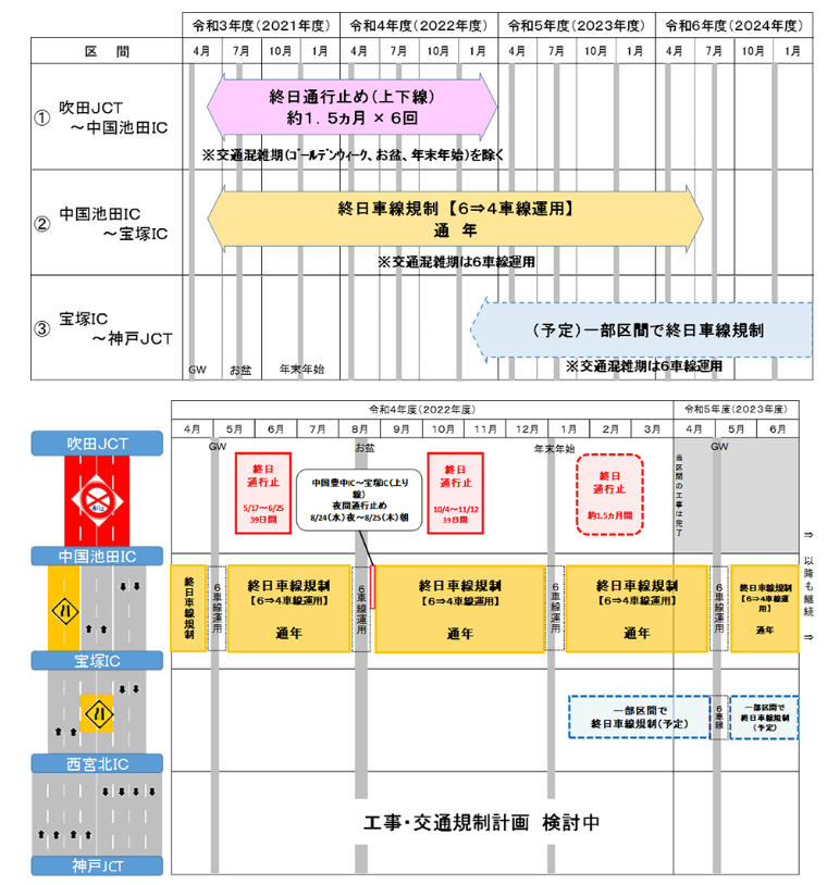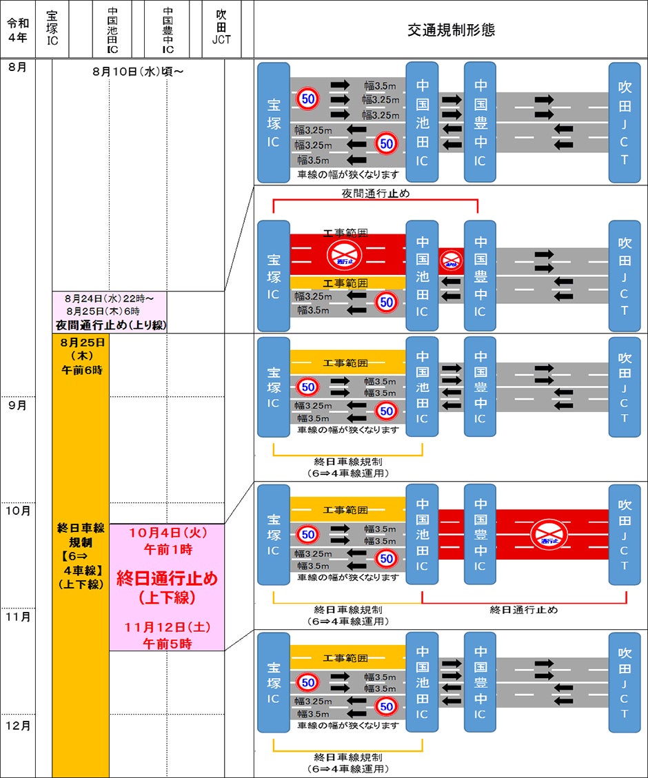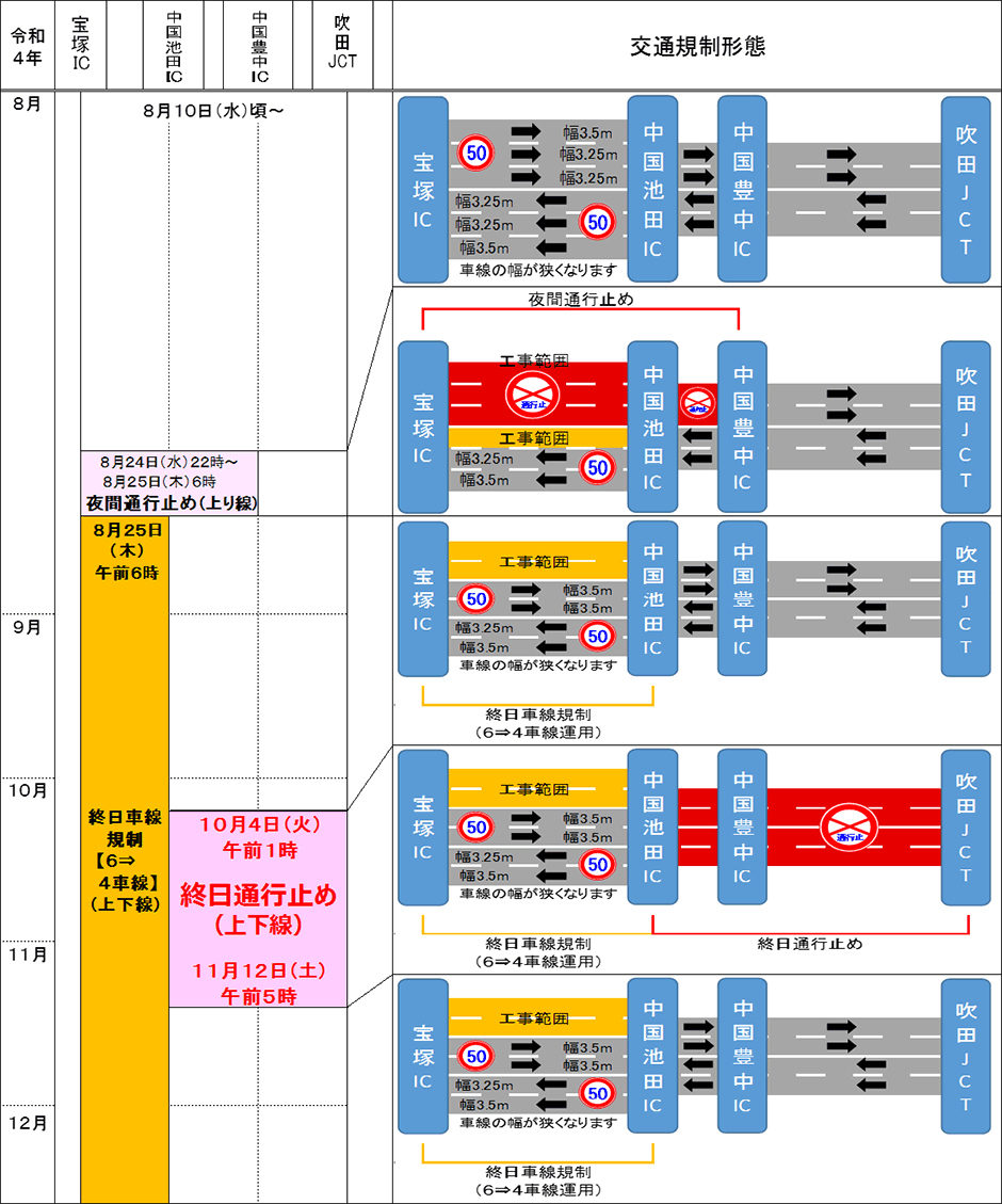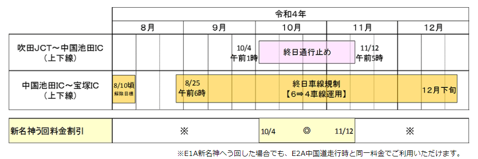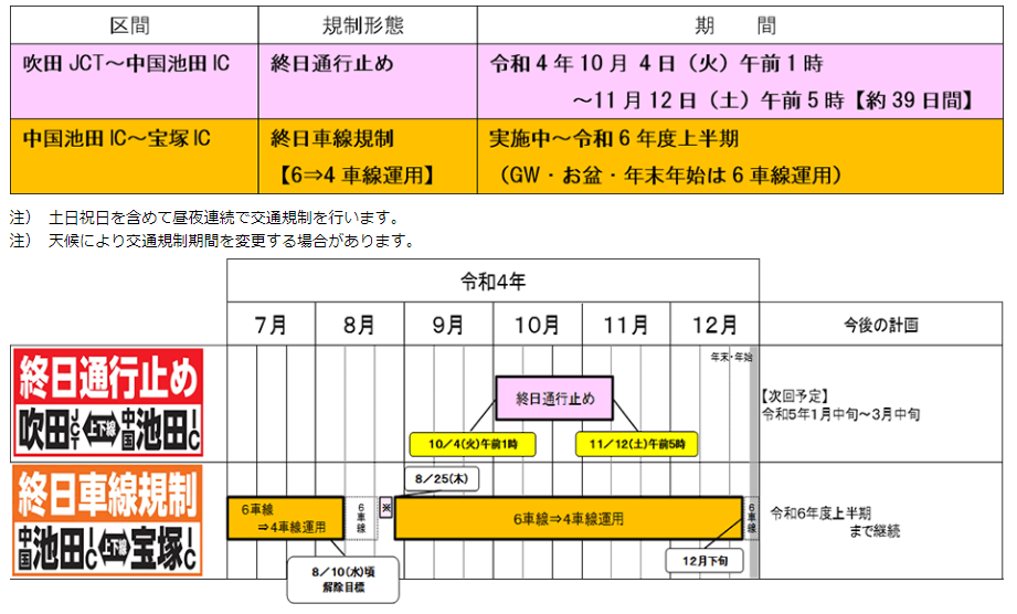E2A 中国自動車道(吹田JCT~宝塚IC)のリニューアル工事 令和4年8~12月の交通規制の日程をお知らせします