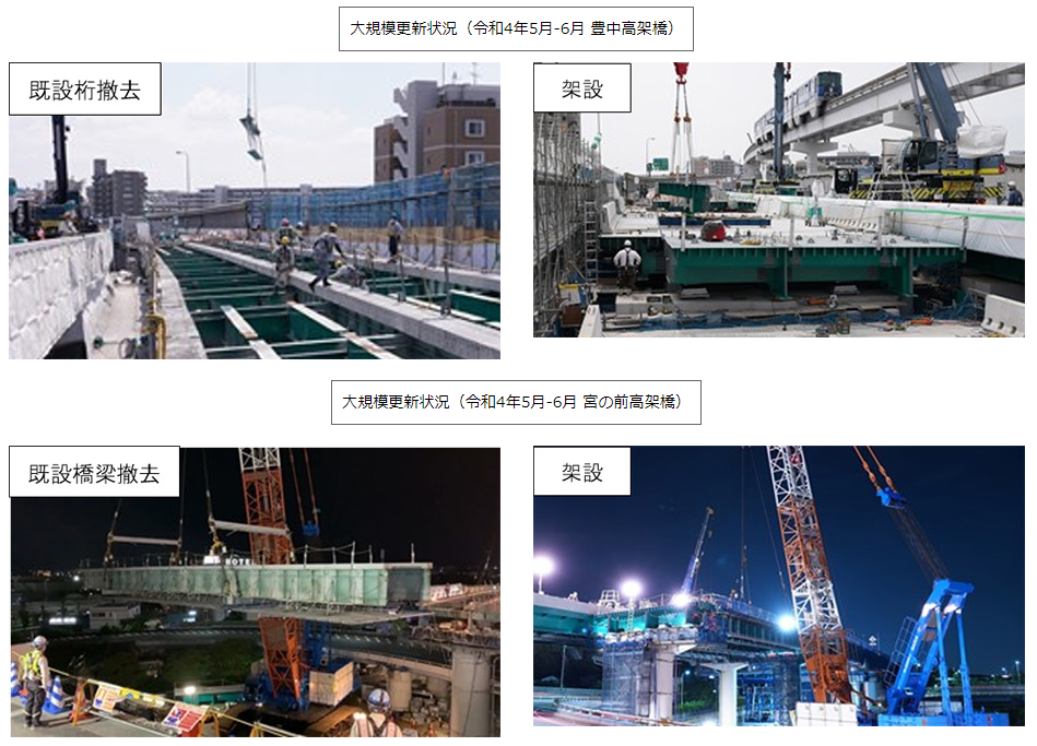 | 大規模更新 | ・橋梁部で老朽化した鋼桁やコンクリート床版を、耐久性に優れた部材に取り替える工事を行います。<3橋(10箇所)で約9,100m2> |