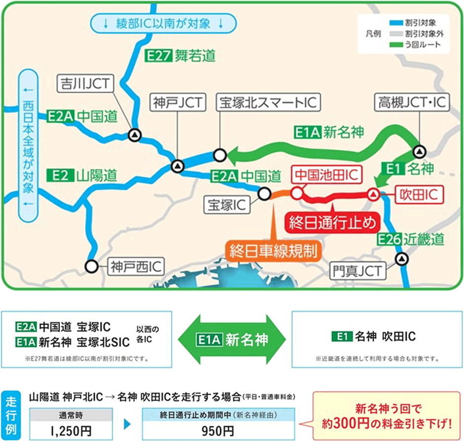 吹田JCT~中国池田IC間の終日通行止め期間中に、下記割引対象ICとE1 名神 吹田ICの相互間を、E1A 新名神へう回し連続走行したETC車については、割引対象ICからE2A 中国道 中国池田ICまで走行した料金と同額に引き下げます。