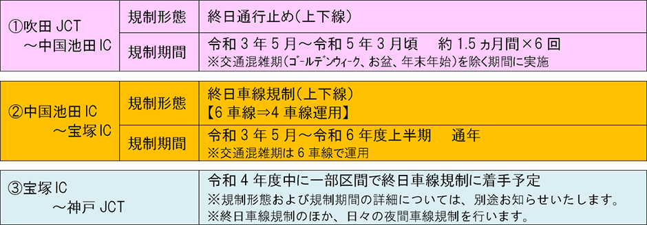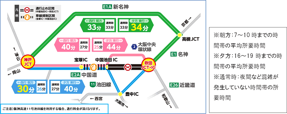 ※中国池田IC~宝塚IC間の一部では、夜間の時間帯において、車線運用を変更する場合があります。通行帯が1車線になる箇所がありますので注意してご通行ください。