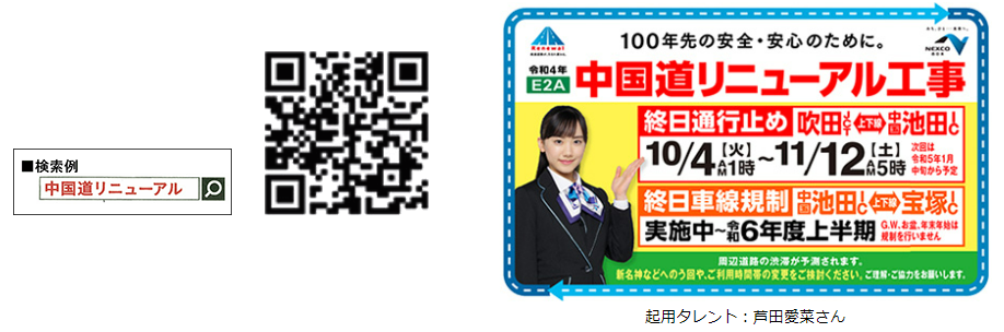 「中国道リニューアル工事専用WEBサイト」において、渋滞予測やう回ルート、う回キャンペーン、う回料金、リアルタイムの所要時間(みちトク交通ナビ)、工事内容、工事の進捗などを提供してまいりますので、お出かけの際は、最新情報をご確認の上、E1A新名神などへのう回やご利用時間の変更などにご協力ください。