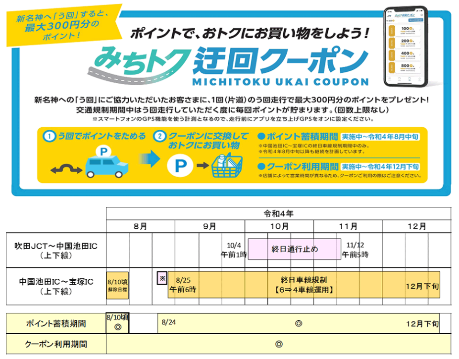 E1A 新名神へのう回にご協力いただいたお客さまに、専用アプリ『みちトク迂回クーポン』を用いたう回キャンペーンを行います。