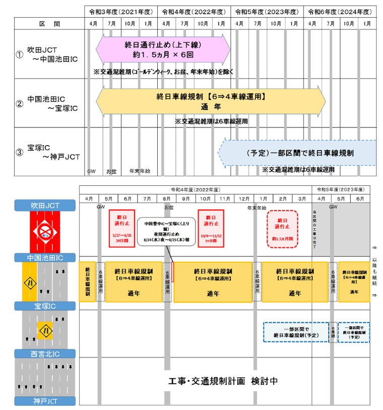 令和3年2月8日の「E2A 中国自動車道(吹田JCT~神戸JCT)でリニューアル工事を実施します」でお知らせしました令和4年度の中国道リニューアル工事について、8~12月に実施予定の吹田JCT~宝塚インターチェンジ(IC)間の交通規制日程などの詳細が決まりましたのでお知らせします。