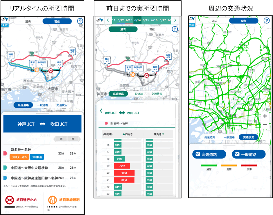 交通規制区間周辺の高速道路および一般道を対象に、リアルタイムの所要時間情報や前日までの実所要時間情報を提供します。