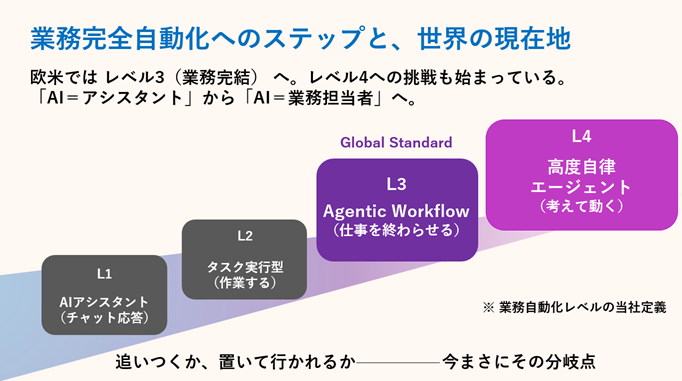 近年、企業の業務プロセス自動化は、世界的に「L1~L4」へ段階的に高度化しています。現在、日本国内ではL1~L2レベルのAIエージェント活用が主流であり、AIエージェントの自律的な意思決定が業務全体に関係してくるL3~L4への移行が大きな課題となっています。最大の障壁は、実務に必要な判断基準・例外処理・前提条件などの業務知識が未構造化のまま暗黙知として存在し、業務担当者・責任者の頭の中に依存したまま残っていることです。