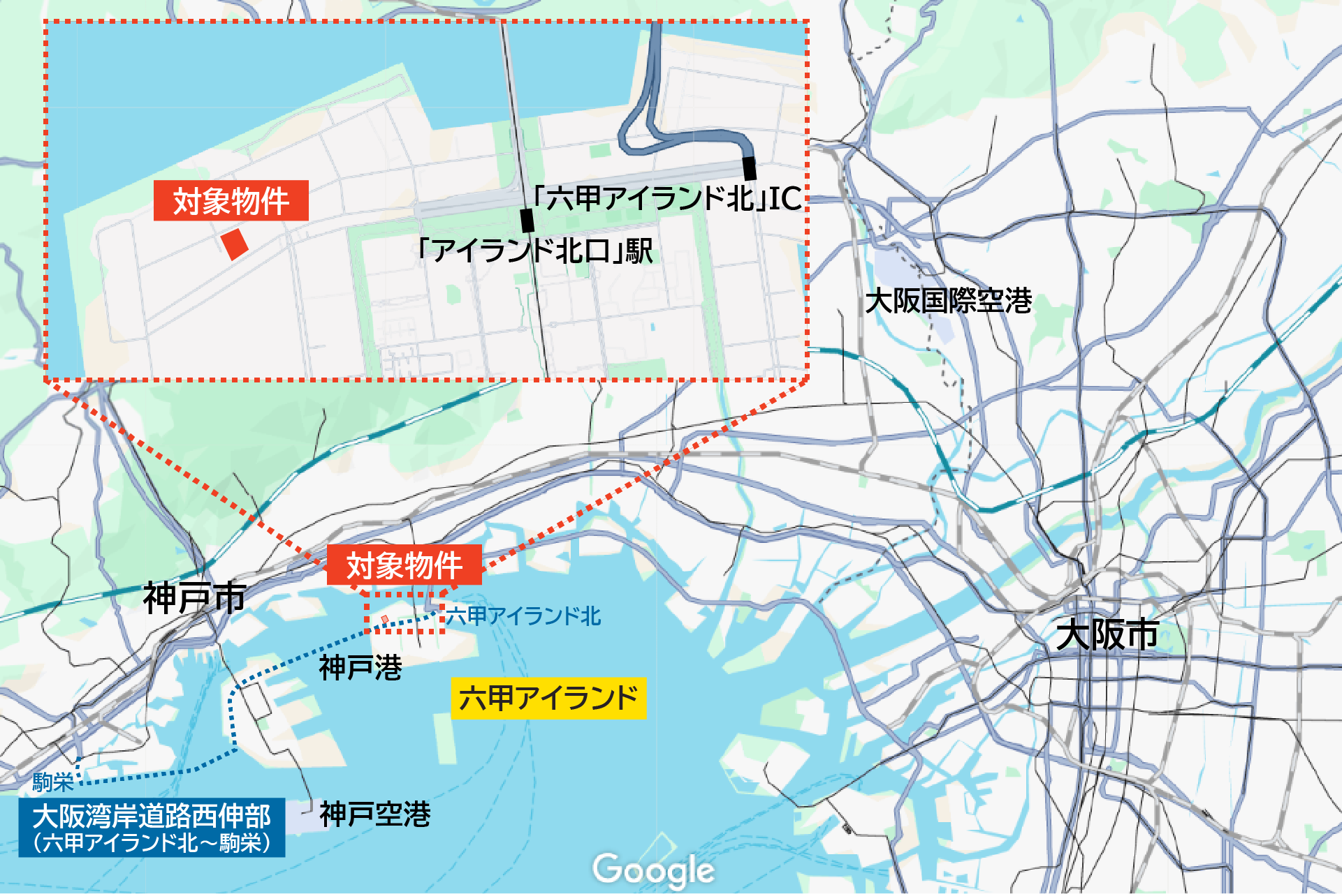 本施設が位置する六甲アイランドは、物流マーケットが好調な近畿圏の中でも湾岸エリア(神戸港)に位置しており、コンテナターミナルを備え、関西主要都市へのアクセスが良好な立地です。阪神高速5号湾岸線「六甲アイランド北」インターチェンジから約2㎞と海運・陸運の配送拠点として優れ、加えて大阪湾岸道路西伸部の整備が進行しており、今後も交通アクセスの向上が見込まれるエリアです。さらに、六甲ライナー「アイランド北口」駅から約 1.5 ㎞に位置し、電車での通勤が可能です。