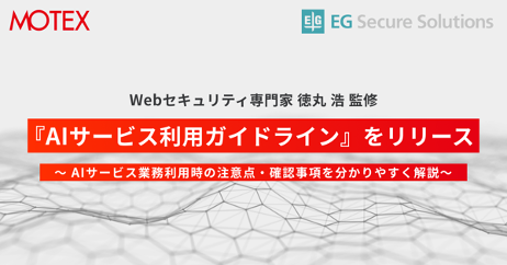 そこで今回、セキュリティ企業として企業・組織のIT環境の安心・安全に携わるEGセキュアソリューションズおよびMOTEXでは、Webセキュリティ専門家 徳丸 浩(イー・ガーディアングループ CISO 兼 EGセキュアソリューションズ 取締役 CTO)監修のもと『AIサービス利用ガイドライン』を作成しました。AIサービスを業務で利用する際の注意点・確認事項を、生成AIならではの注意点や事例も交え、専門的な視点で分かりやすくまとめており、自社・自組織のガイドライン作成の目安としていただくことができます。