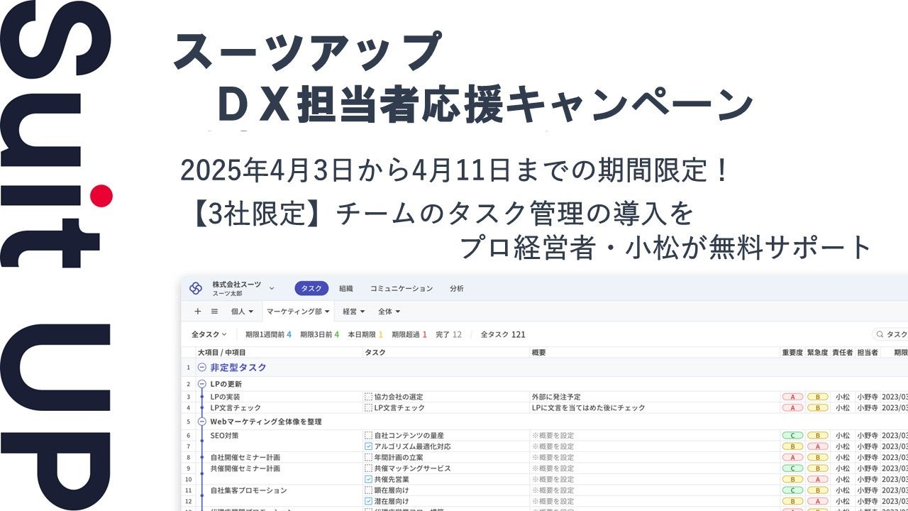 2025年4月3日から4月11日までの期間に、スーツアップの無料お試し30日にお申込みいただきましたDX担当者のうち3社限定で、当社代表者であり中小・中堅企業やスタートアップのバリューアップに実績のあるプロ経営者の小松自ら、チームのタスク管理の導入サポートを無料で行うキャンペーンを実施します。