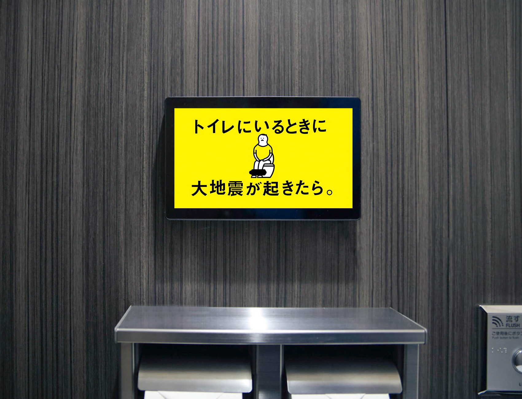 そして今回の“TOKYOもしもFES渋谷 2023”との連携では、トイレの個室というメディア特性を活かした、地震に関するオリジナルコンテンツを配信します。トイレ利用者に向けて「トイレ利用中のもしも」に関する動画を配信することで、「トイレ利用中に大地震が起きた時にどう行動すればいいのか?」というテーマを臨場感を持って伝え、自分ごととして実感できるきっかけを提供します。