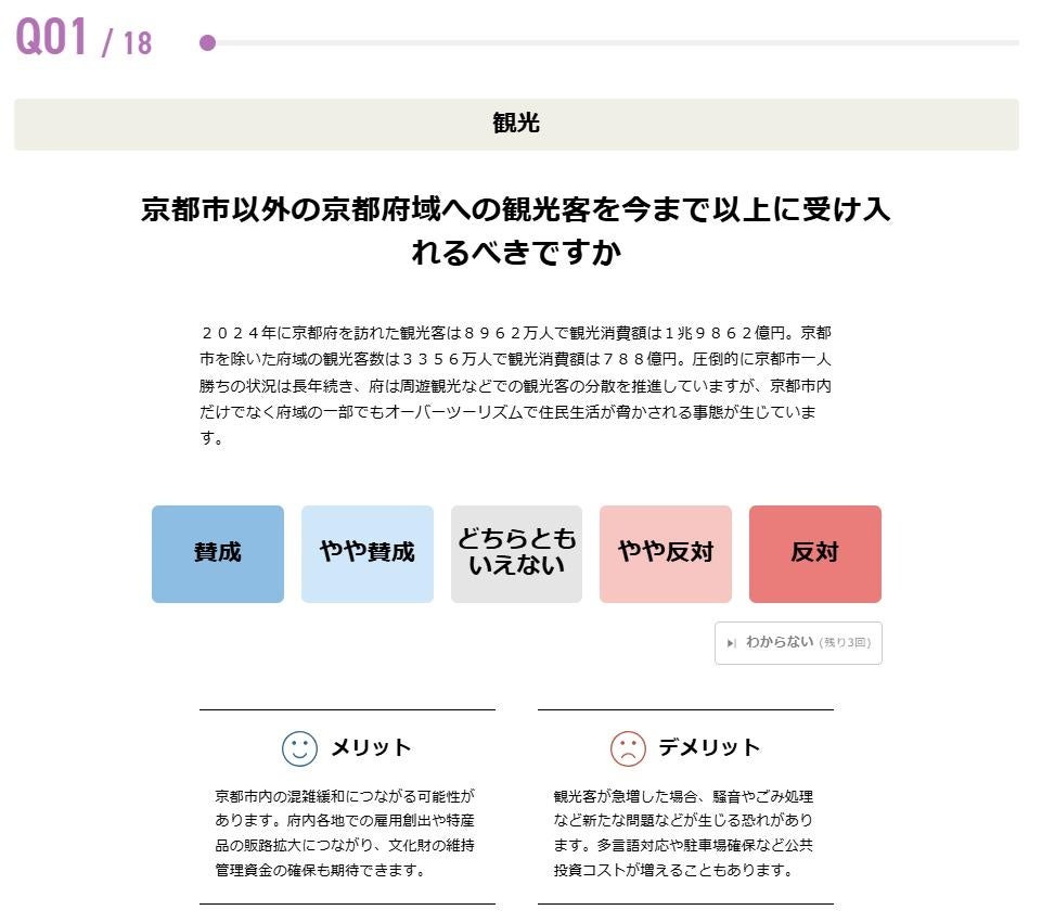 今回の知事選の「争点」として挙げられている観光や北陸新幹線の延伸、府政のあり方など幅広い分野の設問になりますが、全ての質問に概要を説明する「解説文」と「メリット」「デメリット」を記載することで、利用者の判断材料をご提供します。
