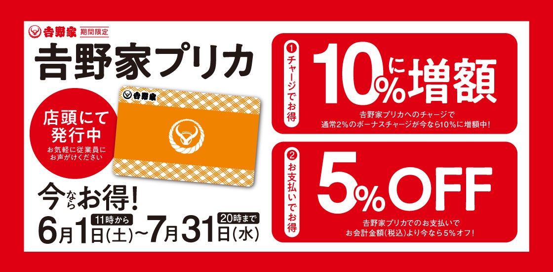 株式会社吉野家(本社:東京都中央区、代表取締役社長:河村泰貴)は、6月1日(土)11時から7月31日(水)20時までの期間、全国の吉野家店舗※で「吉野家プリカ」キャンペーンを開催します。