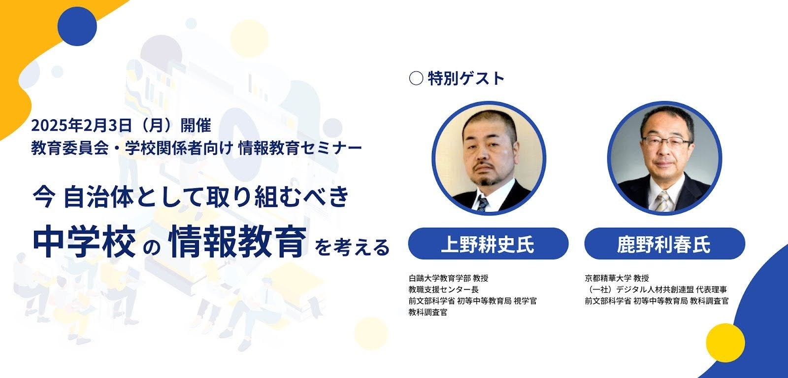 プログラミング教育サービス事業を手がけるライフイズテック株式会社(本社:東京都港区、代表取締役CEO:水野 雄介)は、上野耕史氏(白鷗大学教育学部 教授 教職支援センター長)と鹿野利春氏(京都精華大学 教授)をお招きし、教育委員会・学校関係者向けオンラインセミナー「今 自治体として取り組むべき中学校の情報教育を考える」を2025年2月3日(月) に開催します。