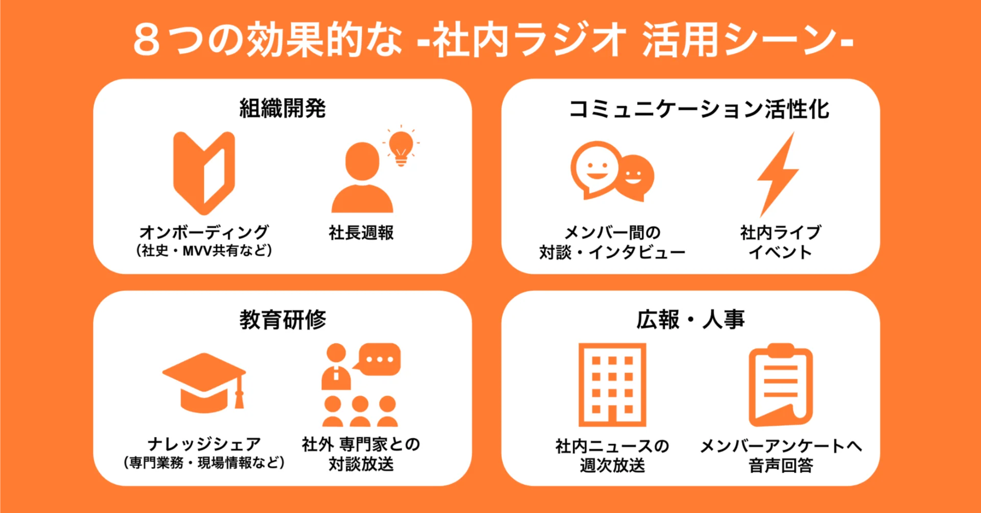 スマートフォン一台で収録・配信ができるVoicy専用の制作アプリを提供、従来のテキストや動画といった社内報に対して、少ない運用コストで実施が可能です。ながら時間に手軽に聴けるのでメンバーの聴取率も高く、インナーブランディングに大きな効果をもたらし、組織を活性化させます。
