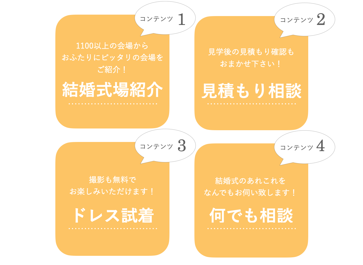 相談カウンターブースでは様々な結婚式相談が可能。全国のエリアの1100以上にもなるハイクラス会場をご紹介いたします。結婚式場相談はもちろんのこと、フォトウェディング、少人数挙式、リゾート挙式、見積もり相談なのど、結婚式に関連する様々な内容が相談可能となっております。