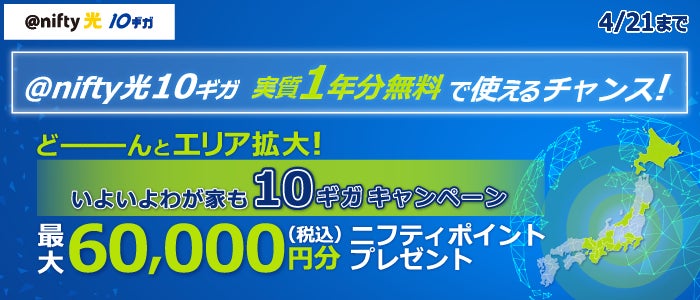 ニフティ株式会社(本社:東京都新宿区、代表取締役社長:前島 一就、以下当社)は、光回線サービス「@nifty光 10ギガ」の西日本提供エリア拡大を記念し、「@nifty光 10ギガ」新規申込者を対象に「@nifty光10ギガ どーーーんとエリア拡大!いよいよわが家も10ギガキャンペーン」を2月26日(月)から実施します。
