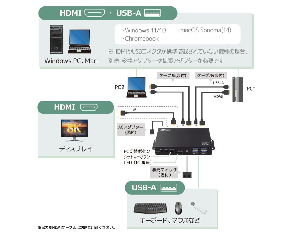 本製品はHDMI端子とUSB Type-A端子が搭載されたパソコンに対応。Windows、Mac、Chromebookに対応しており、異なるOSのパソコン(WindowsとMac)でも切り替え可能です。