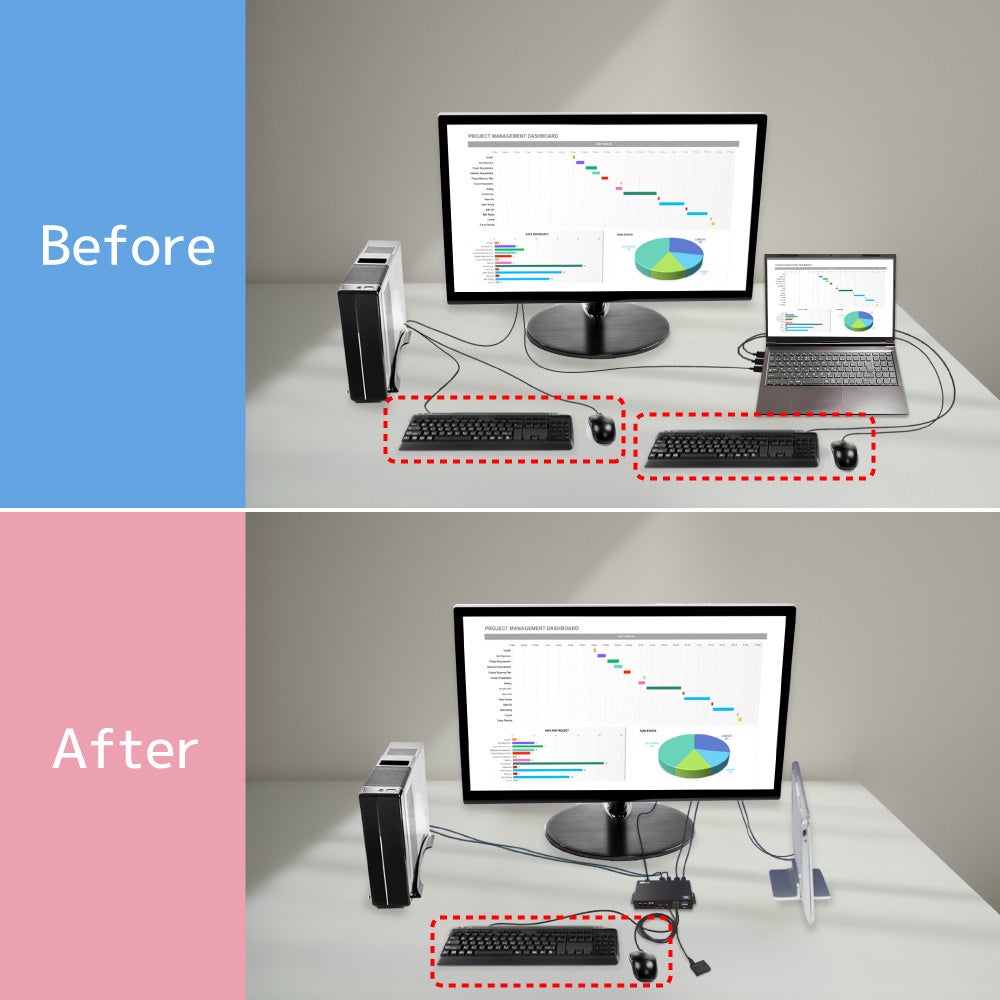 RS-260UH-4K、RS-260UH-8Kは、キーボード、マウス、ディスプレイなどの機器を2台のパソコンで切り替えて操作することができます。それぞれのパソコンに周辺機器を用意する必要がなく、より広々とした操作環境が実現できます。