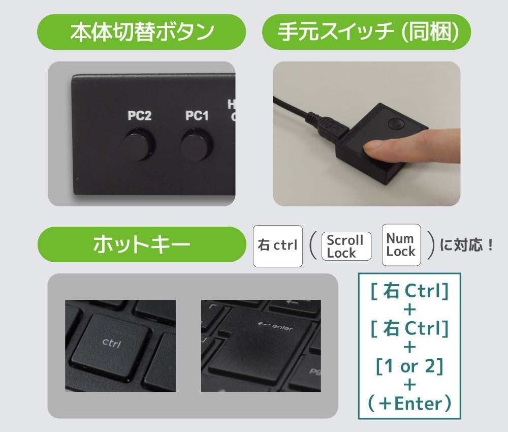 切替器本体に装備する切替ボタン、同梱の手元スイッチ、あるいはキーボード上の[右Ctrl]キーを2度押すホットキーによるパソコンの切替が可能です。