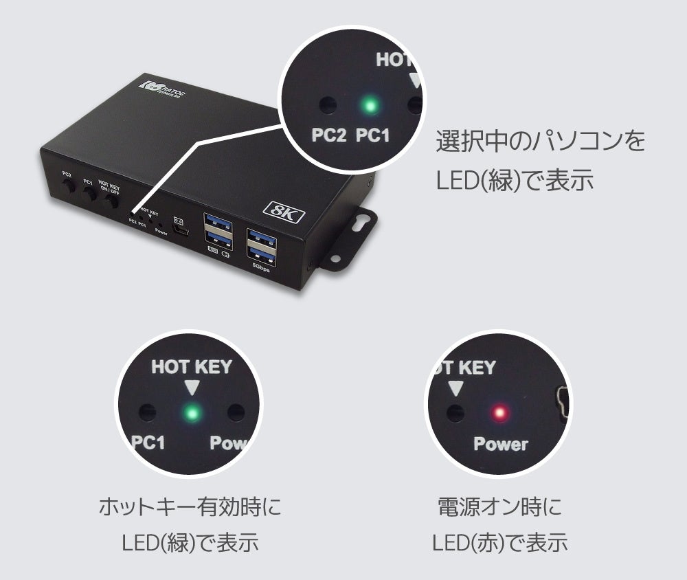 また、選択中のパソコンやホットキーの有効が一目で分かるLEDも搭載しています。