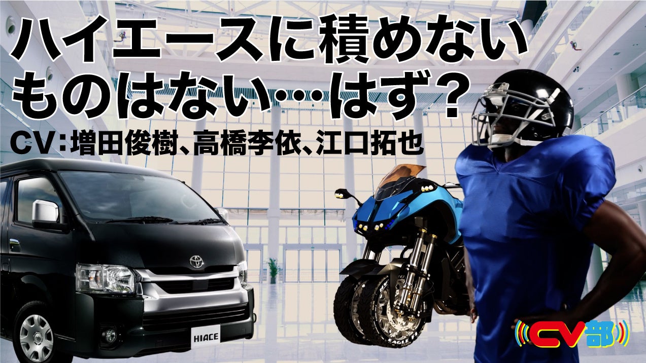 コンテンツスタジオ CHOCOLATE Inc. (本社:東京都渋谷区、代表取締役:渡辺裕介)は、本日1月21日に、身近にある「アレ」に対して、勝手に人格とキャラボイスをあてる“疑人格化”プロジェクトでチャンネル登録者数20万人を突破したYouTubeチャンネル・CV部にて、トヨタ自動車スポンサードのもと制作した最新作「これ積めます?ハイエースさん(CV:増田俊樹、江口拓也、高橋李依)」を公開したことをお知らせいたします。本作では、TOYOTAのハイエースに声優の増田俊樹が、来店するお客さんたちに江口拓也、高橋李依らがアテレコ。とんでもないものまで積み込もうとするクセのあるお客さんたちに、ハイエースが華麗なツッコミをしていく内容となっています。