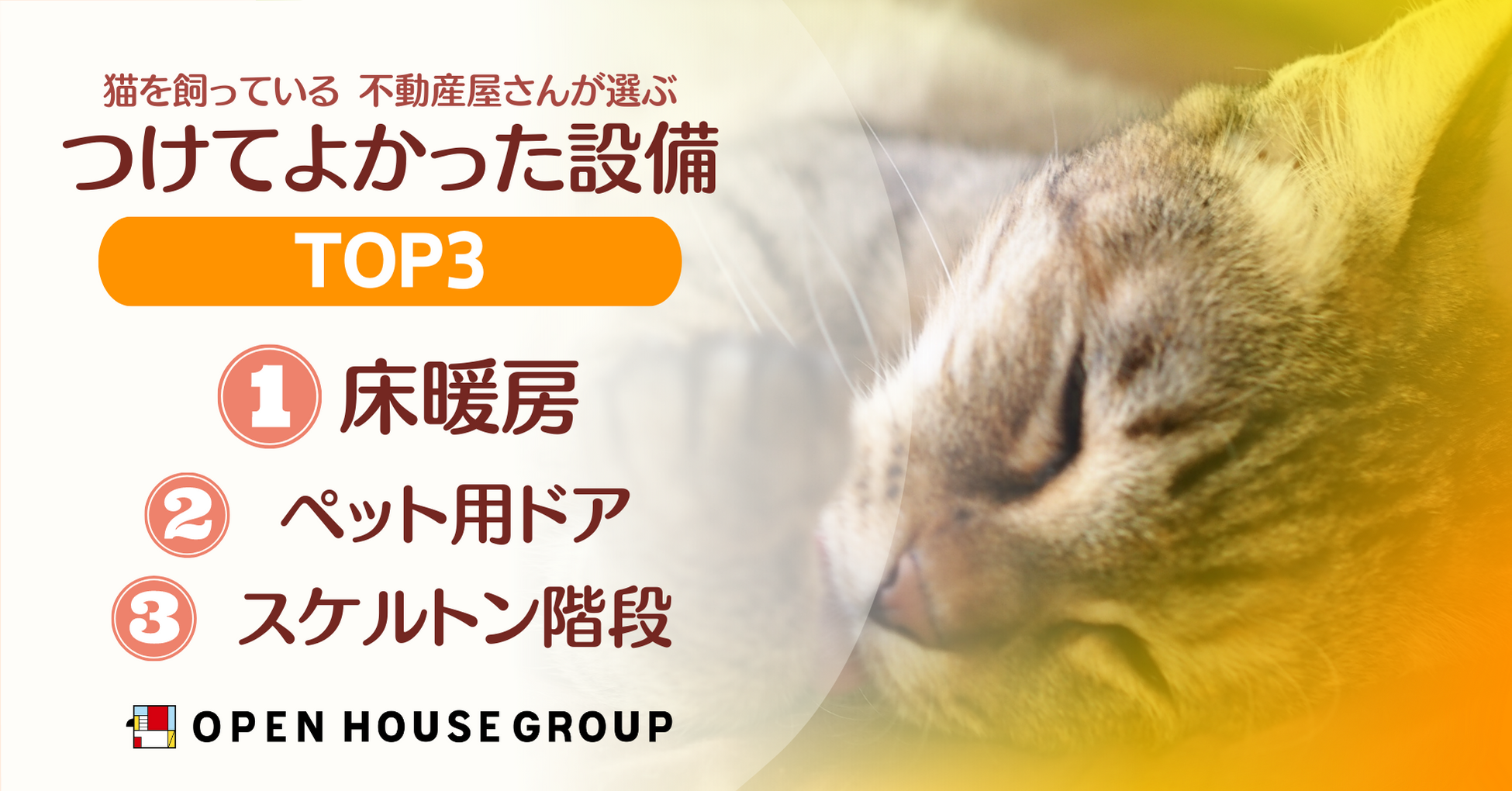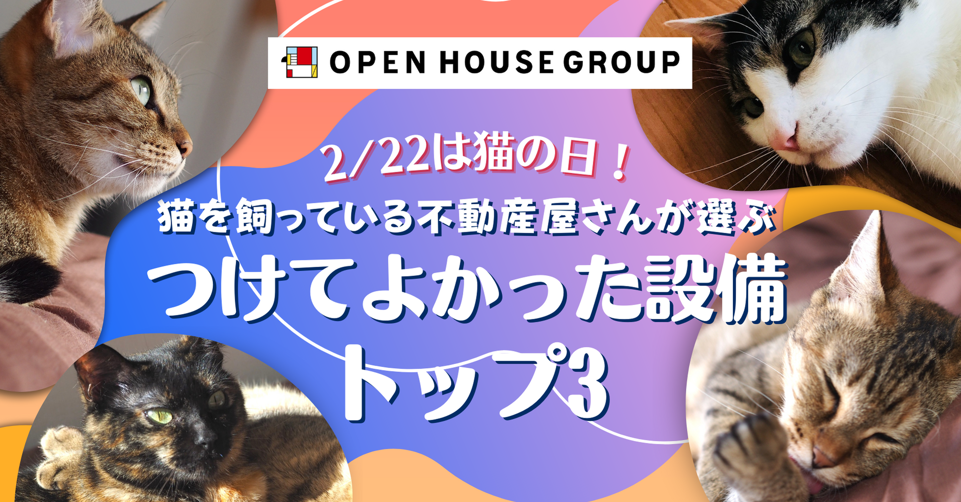 株式会社オープンハウスグループ(本社 東京都千代田区、代表取締役社長 荒井正昭、以下「当社」)は、本日、2(にゃん)月22(にゃんにゃん)日の猫の日にちなみ、猫を愛する当社社員の猫たちのリアルな声を集めた、猫による猫のためのお家におすすめの設備や生活の工夫についてまとめた情報をお送りいたします。