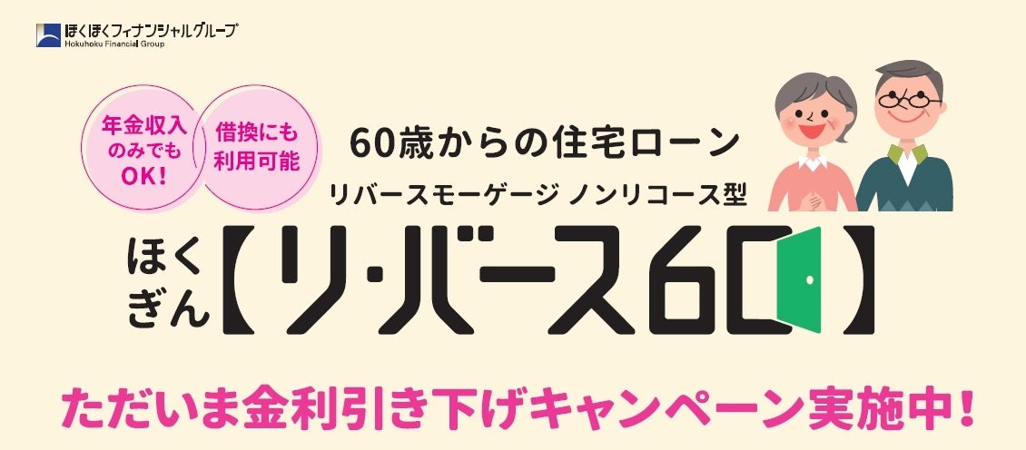 北陸銀行(頭取 中澤 宏)は、リバースモーゲージ型ローン「ほくぎんリ・バース60」のキャンペーン実施および取扱店舗を追加しますのでお知らせいたします。