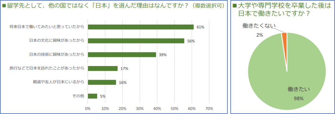 当社では、日本語学校に在籍し、卒業後に大学等高等教育機関への進学を目指す外国人留学生へ進路希望アンケートを実施(※1)、回答者の98%が「卒業後は日本での就労を希望」を選択しています。