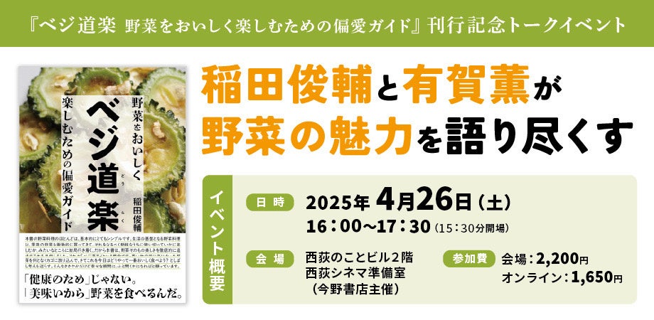 発売を記念し、4月26日(土)にトークイベントを開催します。著者の料理人・稲田俊輔氏と、スープ作家・有賀薫氏が登壇し、野菜の魅力や野菜料理の奥深さについて語り尽くします。